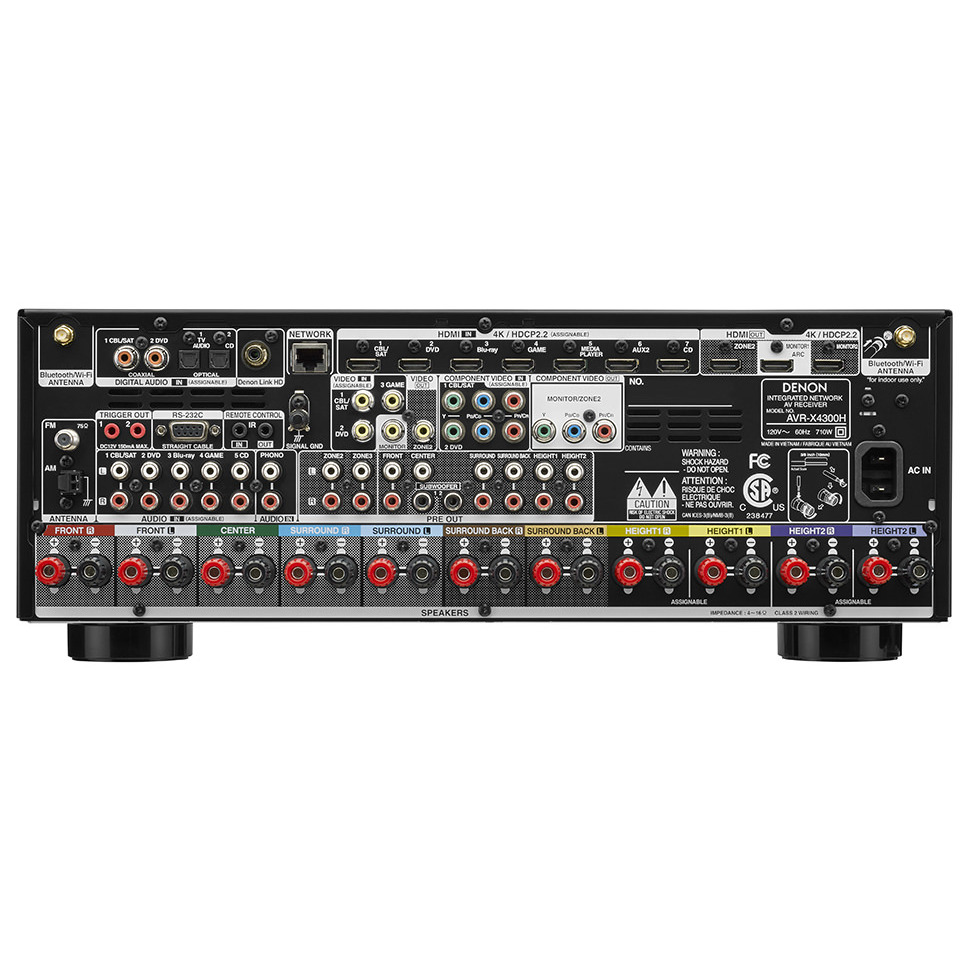 Denon AVR-X4300H обладает современным сетевыми функциями, способен воспроизводить файлы популярных форматов, в том числе PCM HD и DSD, а также оснащен Wi-Fi и Bluetooth. К USB-разъему на передней панели можно подключить накопитель с музыкальными файлами или iPod/iPhone; также Denon AVR-X4300H поддерживает и беспроводное соединение Airplay.