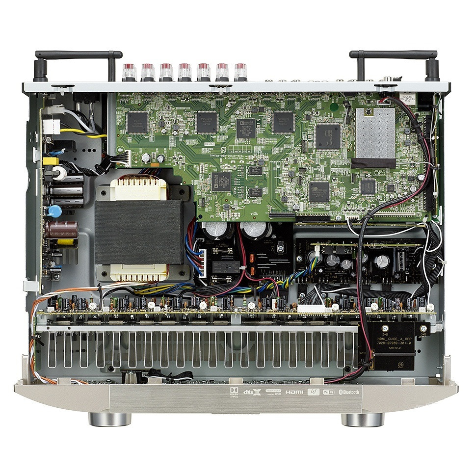 C качественным 7.2-канальным усилителем техника обеспечивает детализированное выходное звучание в диапазоне частот 20-20000 Гц с мощностью 50 Вт при коэффициенте нелинейных искажений 0.08%. При сопротивлении 6 Ом и значении КНИ 10% показатель мощности на канал составляют 100 Вт. Благодаря наличию фирменного цифро-аналогового преобразователя AV-ресивер без проблем обеспечивает воспроизведение Hi-Res аудио и форматов FLAC, WAV, ALAC, DSD. Технология автоматической калибровки Audyssey MultEQ максимально оптимизирует звук под помещение, при этом поддержка декодеров окружающего звучания Dolby Atmos и DTS:X гарантирует формирование правдоподобной трехмерной аудиосцены.
