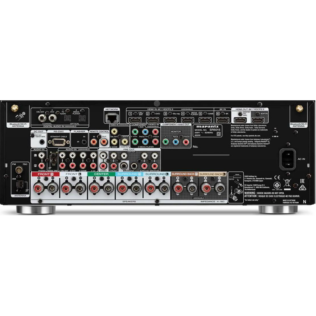Marantz SR5015 выполнен на базе фирменных усилительных модулей HDAM, а в его звуковой части установлены 32-битнные ЦАП AK4458. В ресивере имеется шесть HDMI-входов и два выхода, которые имеют поддержку видео 8K/HDR10/Dolby Vision, а также нового возвратного аудиоканала eARC и сертификата HDCP 2.3. Среди других возможностей подключения в Marantz SR5015 можно отметить Phono-вход для MM-звукоснимателей и USB для подключения портативных носителей.