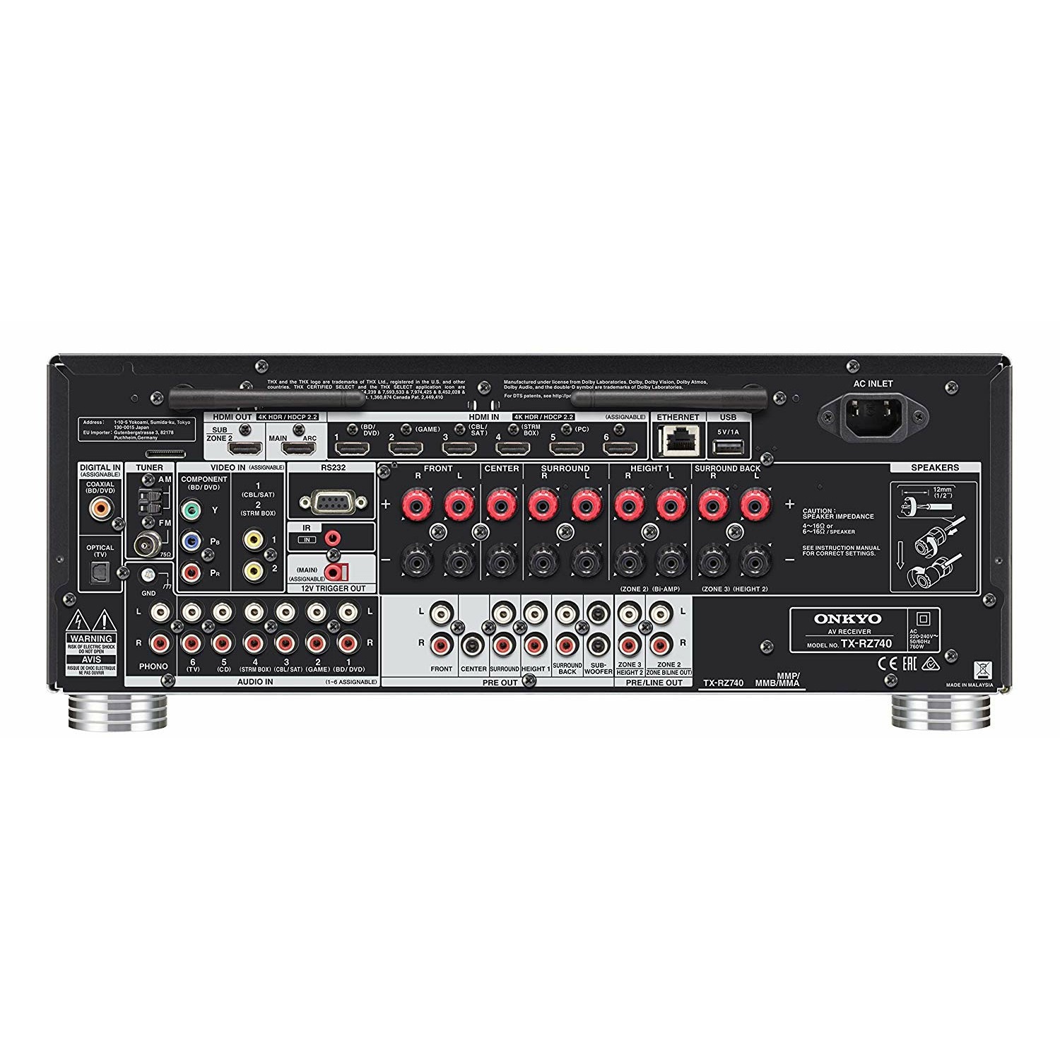 На тыльной панели Onkyo TX-RZ740 присутствуют шесть HDMI-входов с поддержкой 4K (60 Гц), форматов HDR10, Dolby Vision, HLG (для телетрансляций) и протокола HDCP 2.2. Есть HDMI-выход с возвратным каналом, а также HDMI для второй зоны. Имеется 11.2-канальный Pre Out, вход для MM-фонокорректора, Ethernet-порт, коаксиальный и оптические входы. Подключить АС можно с помощью 9 пар винтовых клемм.