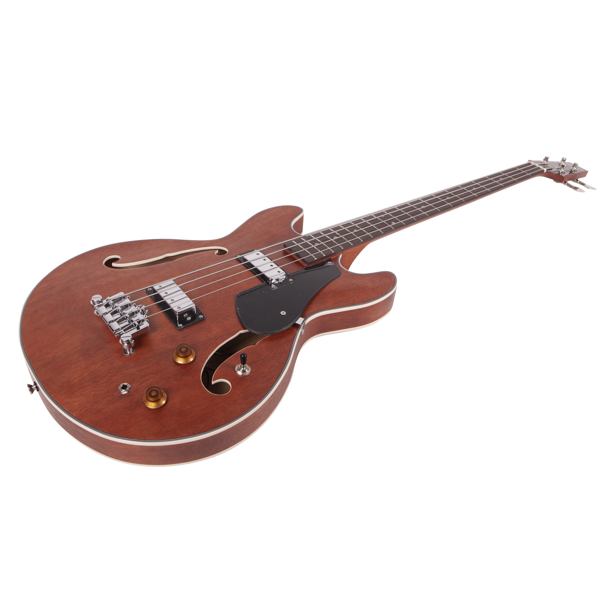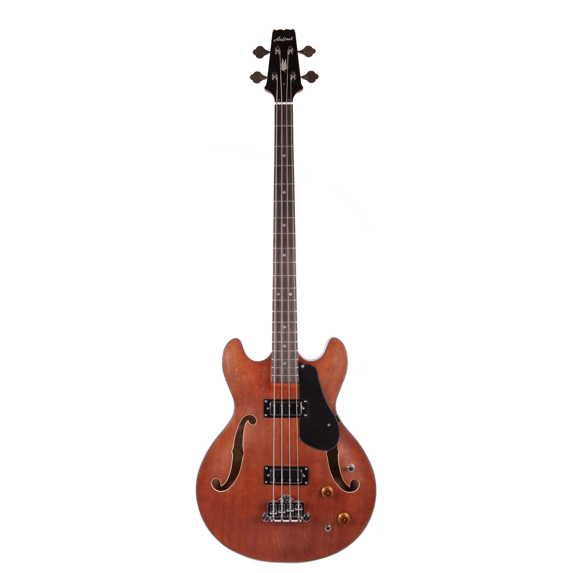 ARIA TAB-TR1 - 4-х струнная бас-гитара, серии Hollow Body, созданная на основе классической ES конструкции. Данная модель характеризуется полностью полым корпусом с двумя вырезами, сделанным из красного дерева (задняя дека, обечайки, топ), мензурой - 860 мм, грифом из 3-х слоёв красного дерева (вклеенный), 20-ю ладами и инкрустациями в виде точек, фирменной электроникой Aria, хромированной фурнитурой и винтажными колками.