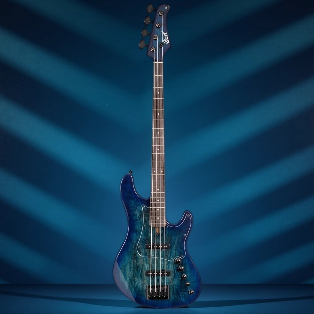 Четырехструнная версия представлена в эффектном цвете Blue Burst (синий санберст) с лаковой отделкой, которая делает текстуру дерева еще более выразительной.