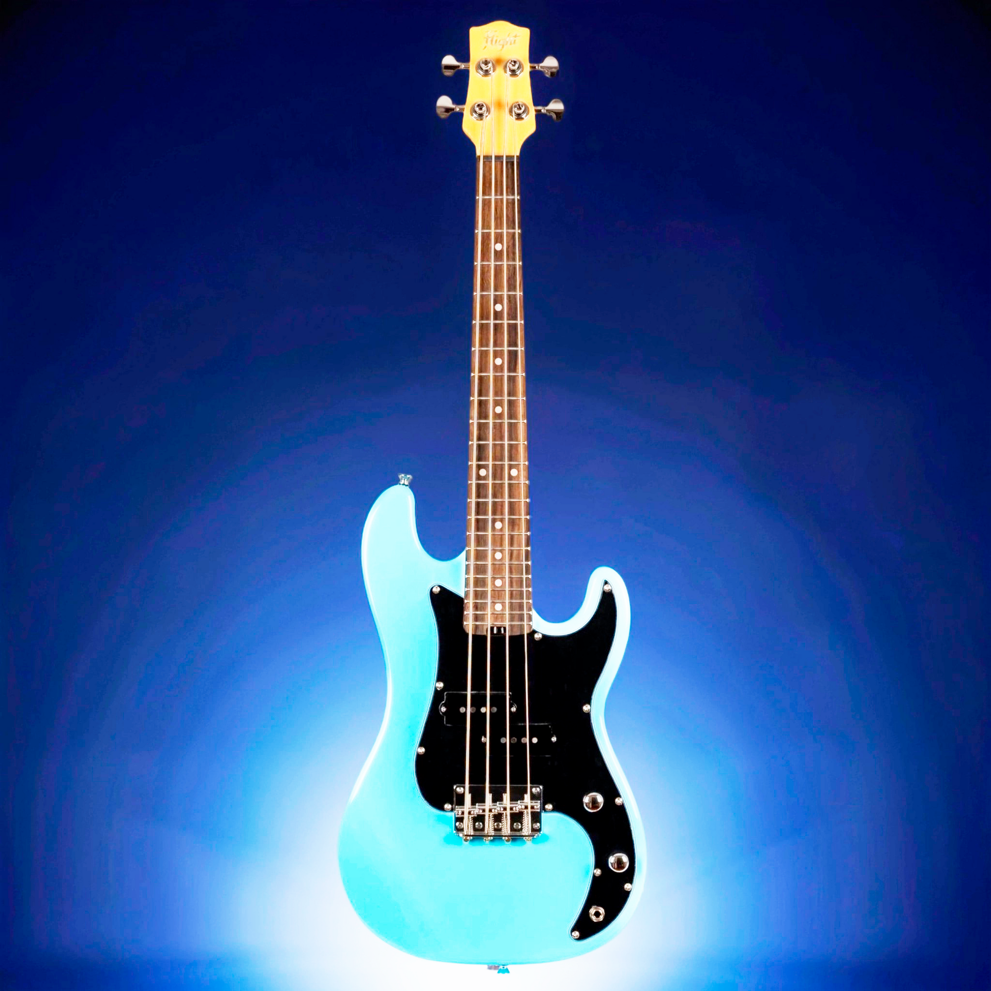 FLIGHT Mini Bass Lite BL — миниатюрная, но мощная бас-гитара, в голубом цвете, которая идеально подходит для гастролирующих музыкантов. Несмотря на компактный размер (мензура 23" / 595 мм), инструмент сохраняет стандартный строй (EADG) и обладает насыщенным, чётким звучанием благодаря датчикам Alnico 5 и корпусу из тополя.