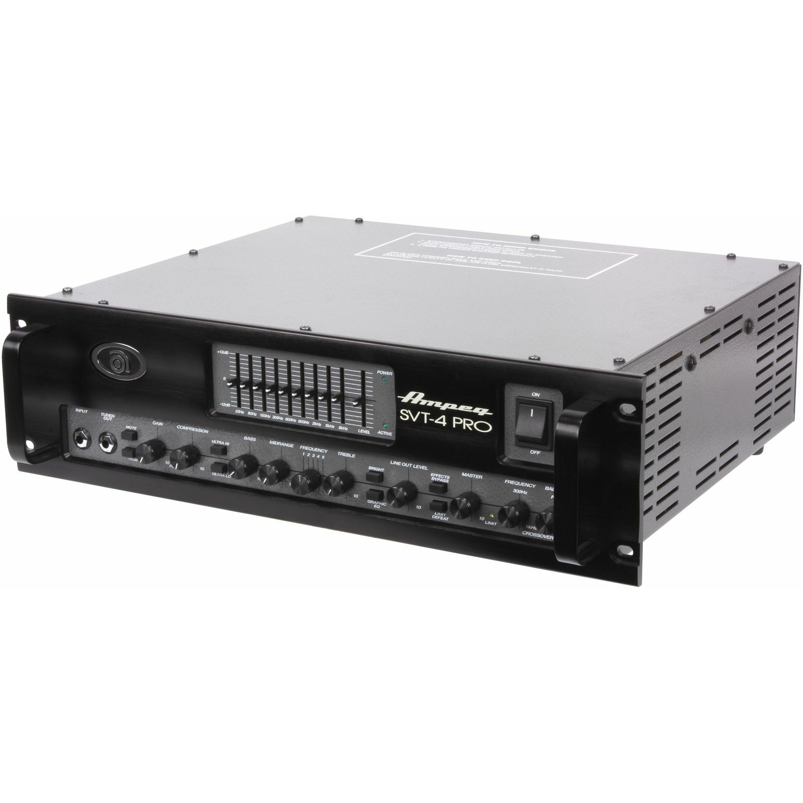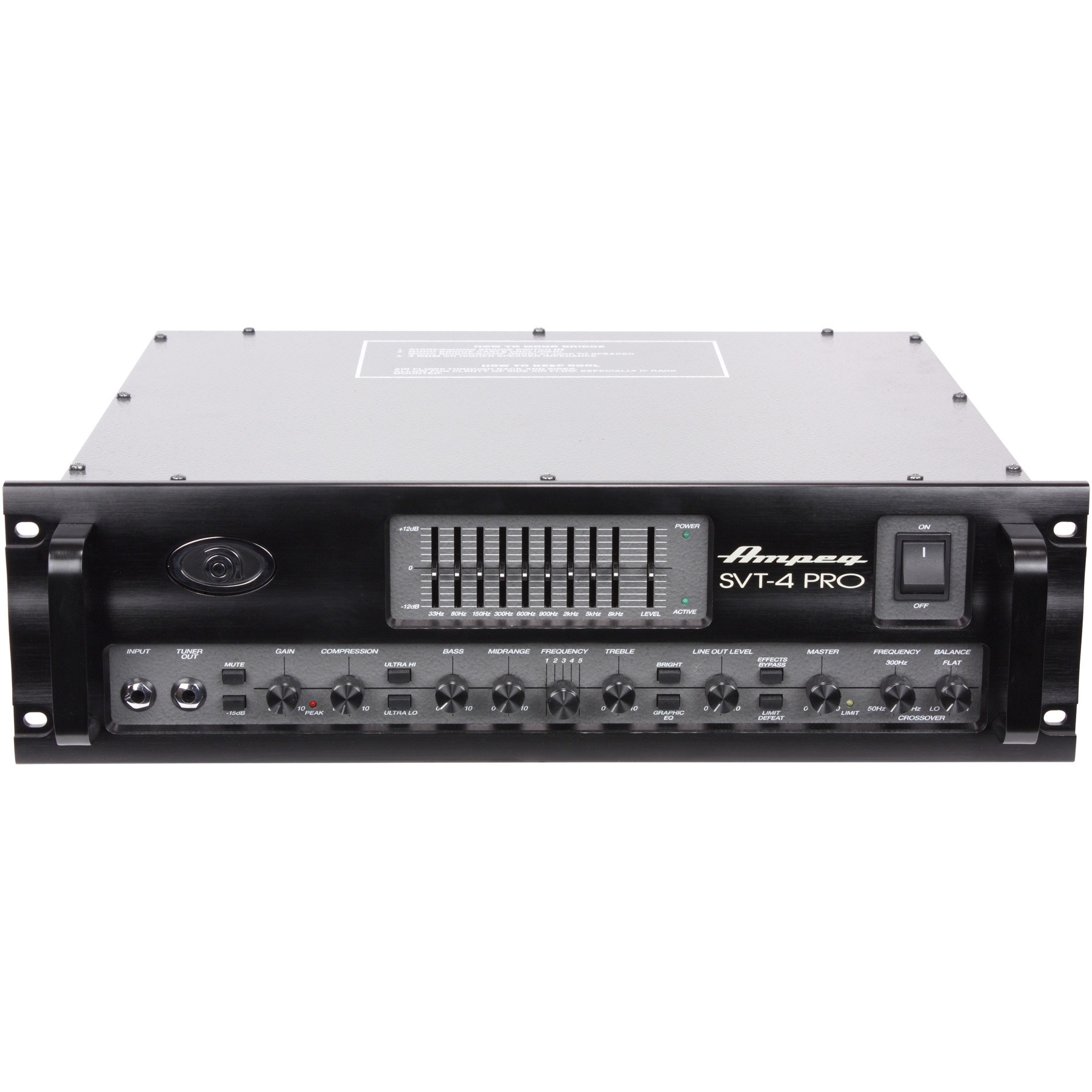 SVT-4 PRO - самый мощный из существующих басовых усилителей. Оконечный усилитель аппарата, выполненный на полевых транзисторах, имеет два канала и может работать как в стерео (или двойное моно), так и в мостовом моно режиме (Mono Bridge). Каждый из каналов развивает мощность в 600 Вт (RMS) при сопротивлении нагрузки 2 Ом, 490 Вт при сопротивлении нагрузки 4 Ом, или 300 Вт при сопротивлении нагрузки 8 Ом. В мостовом режиме мощность достигает 1200 Вт (RMS) при сопротивлении нагрузки 4 Ом, или 900 Вт при сопротивлении нагрузки 8 Ом (максимально допустимая мощность в этом режиме равна 1600 или 1200 Вт при тех же сопротивлениях нагрузки). Охлаждение принудительное, осуществляется встроенным вентилятором. В целях повышения надежности этой мощнейшей системы применены реле, предназначенные для защиты от переходных процессов, возникающих на выходах при включении аппарата. Усилитель занимает трехрэковое пространство, имеет резиновые ножки. При установке в открытый рэковый кейс PR-RC 3 усилитель превращается в полноценную "голову".