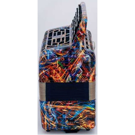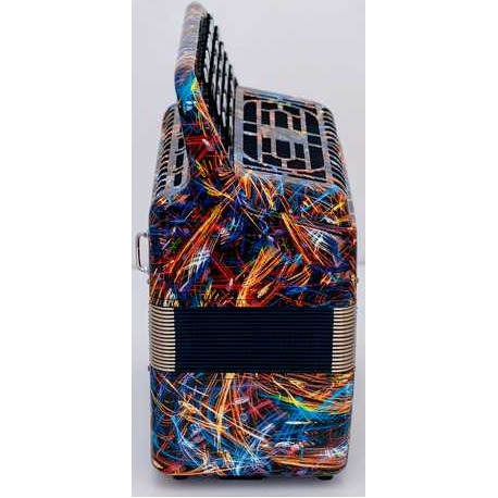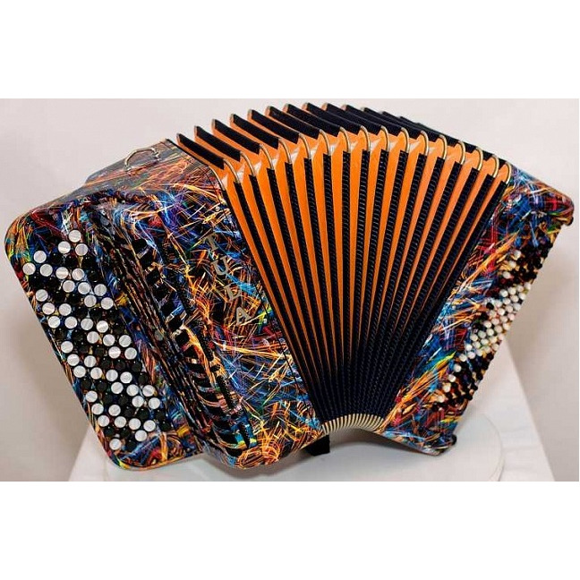 Пятирядная правая клавиатура двухголосное звучание 46 нот от ноты МИ малой октавы до ноты ДО диез четвертой октавы, в левой части (басы) готовый аккомпанемент от ноты "Ля" контроктавы до ноты "соль диез" большой октавы.