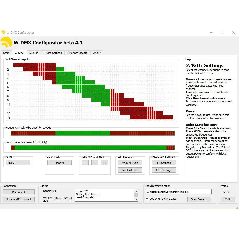 Wireless Solution W-DMX Dongle 2.0 - программатор для приёмо-передающих устройств Wireless Solution. Для частичного или полного ухода от интерференционных помех шведская компания Wireless Solution рекомендует использовать программную маскировку каналов с высоким уровнем трафика или попросту фильтровать каналы, чрезмерно загруженные сторонними радиоприборами. В ассортименте Wireless Solution для этого используется устройство-программатор W-DMX™ Dongle 2.0 и программное обеспечение W-DMX Configurator. С помощью этого программно-аппаратного комплекта можно не только создавать маску рабочих частот для устройств беспроводной передачи протокола DMX, но и осуществлять настройку других параметров и производить обновления обеспечения.