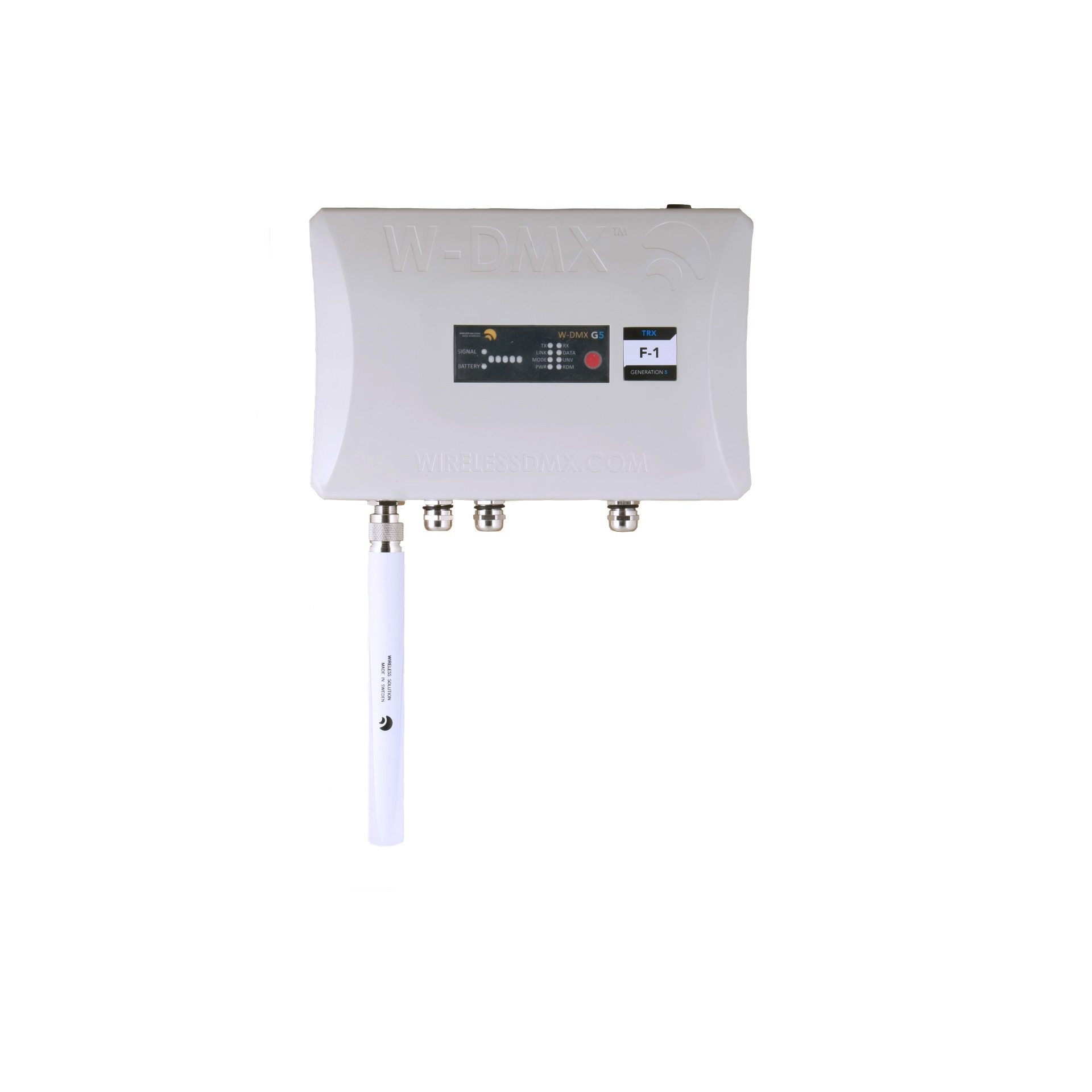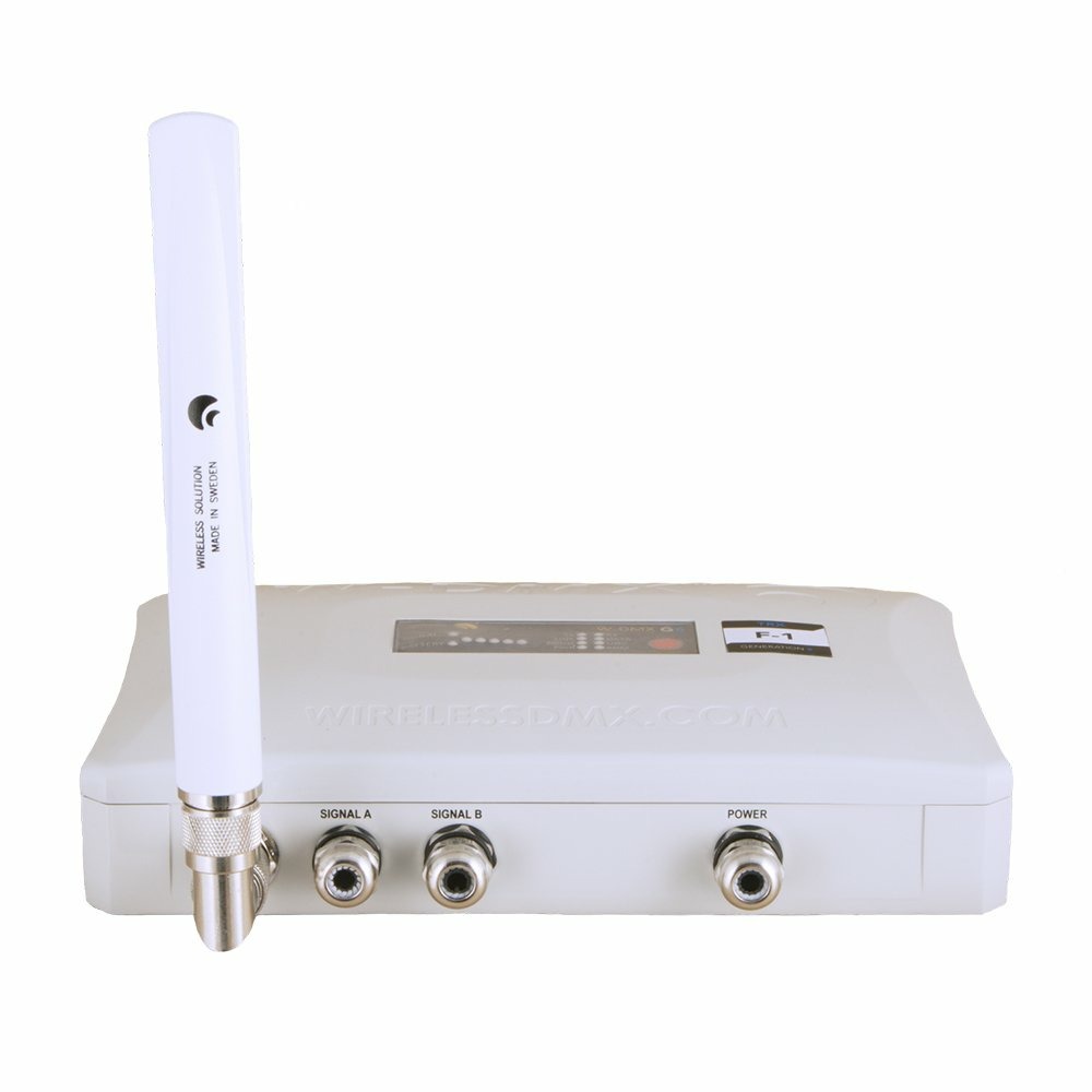 Wireless Solution WhiteBox F-1 G5 - передатчик или приёмник 512 каналов DMX с возможностью расширения до 1024 каналов в режиме Double-Up (режим Double Up не поддерживает RDM и управление по протоколам Art-Net и sACN). Устройство Wireless Solution WhiteBox G5 обладает тем же функционалом, что и BlackBox, но предназначен для использования вне помещений, для работы с всепогодным архитектурным освещением и оборудованием. Это индустриальный стандарт в области беспроводной передачи протокола DMX: дистанция передачи до 700 метров с комплектуемыми антеннами и до 3 000 метров с опциональными антеннами, поддержка RDM, сменные антенны, корпус со степенью защиты оболочки IP66, опциональный модуль поддержки протоколов Art-Net и s/ACN. Поколение WhiteBox G5 расширяет возможности устройств функцией Double-Up, задействовав которую можно вдвое увеличить количество каналов DMX: с 512 до 1024 каналов у модели WhiteBox F-1 G5 и с 1024 до 2048 каналов у модели WhiteBox F-2 G5.