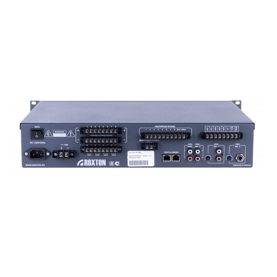 Комбинированный преобразователь ROXTON RP-8264 (далее моноблок) работает в составе цифро-аналоговой системы оповещения ROXTON-8000. Представляет собой блок 19” исполнения, совмещающий в себе функции многоприоритетного предварительного усилителя, 8-ми зонного селектора/коммутатора 4-х внешних усилителей мощности на 8 линий громкоговорителей, блока автоматического контроля линий громкоговорителей и зарядного устройства. Моноблок снабжен входами для подключения сигналов от пожарной станции, от систем централизованного оповещения (ЦСО) о чрезвычайных ситуациях (ГО и ЧС). Моноблок дистанционно управляется и контролируется дополнительными устройствами системы ROXTON-8000, в комбинации с которыми представляет собой особо эффективную систему оповещения. Комбинированный преобразователь ROXTON RP-8264 имеет пожарный сертификат и может использоваться в качестве технического средства СОУЭ, ЛСО, ОСО.