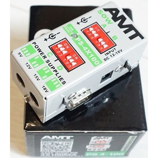 Величина каждого выходного напряжения может быть установлена в одно из четырех значений: 9VDC, 12VDC, 15VDC, 18VDC. Модуль предназначен для питания гитарных педалей, потребляющих не более 100 mA, таких как AMT Electronics: преампы серии LA, гитарные эффекты FX, педали перегруза DRIVE.