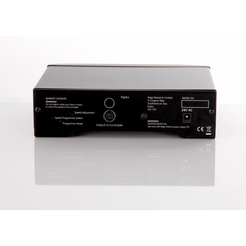 Оснащён специальной системой фильтрации питания, а также стабилизации напряжения на выходе, что обеспечивает беспрецедентную стабильность оборотов диска (0.1%) проигрывателя при практически полном отсутствии шумов, вызванных питанием. Компактный размер блока питания хорошо сочетается с другими устройствами REGA, например, фонокорректором FONO и усилителем для наушников EAR. Более того, TT PSU позволяет изменять скорость вращения диска (33 1/3 / 45 об -1) нажатием кнопки без демонтажа опорного диска и перестановки пасика на проигрывателе. Блок питания Rega TT PSU Black предназначен только для проигрывателей виниловых дисков REGA, имеющих возможность работы от блока питания с напряжением постоянного тока 24 В.