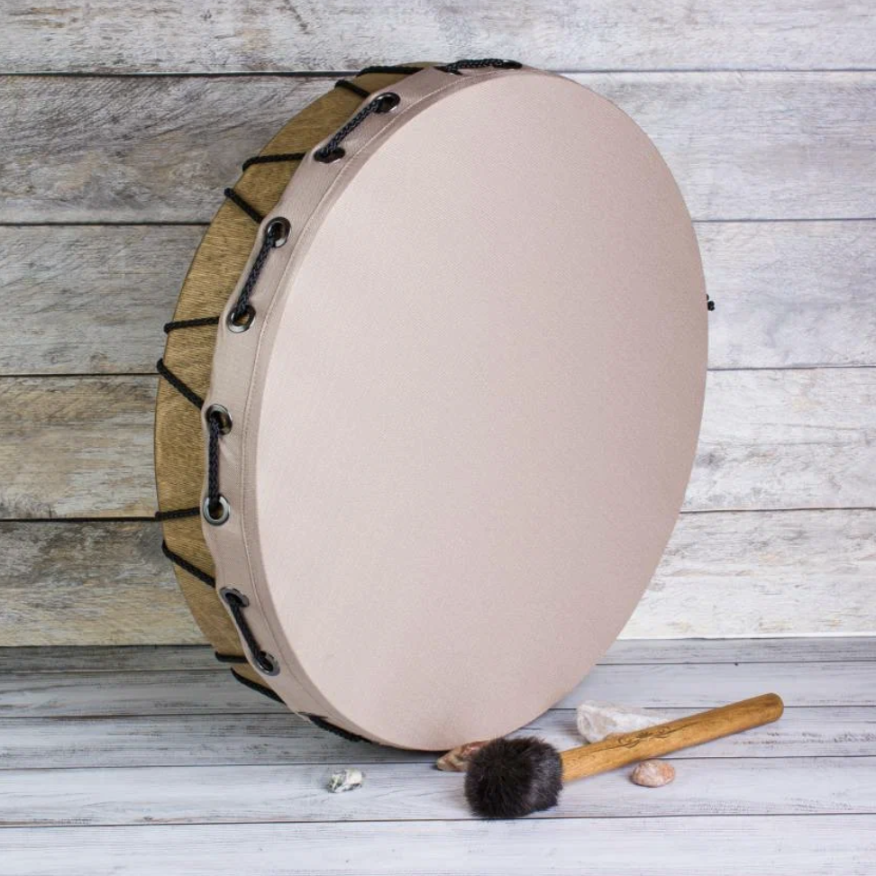 шаманский бубен диаметром 50 сантиметров (20 дюймов) бежевого цвета. Он предназначен для медитации, звукотерапии, шаманских практик, обрядов, гвоздестояния, энергетического массажа, фестивалей и духовных путешествий.