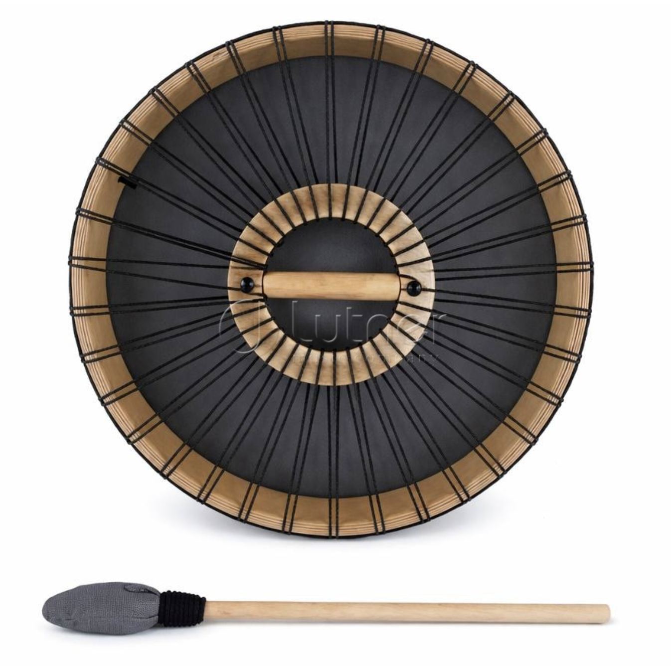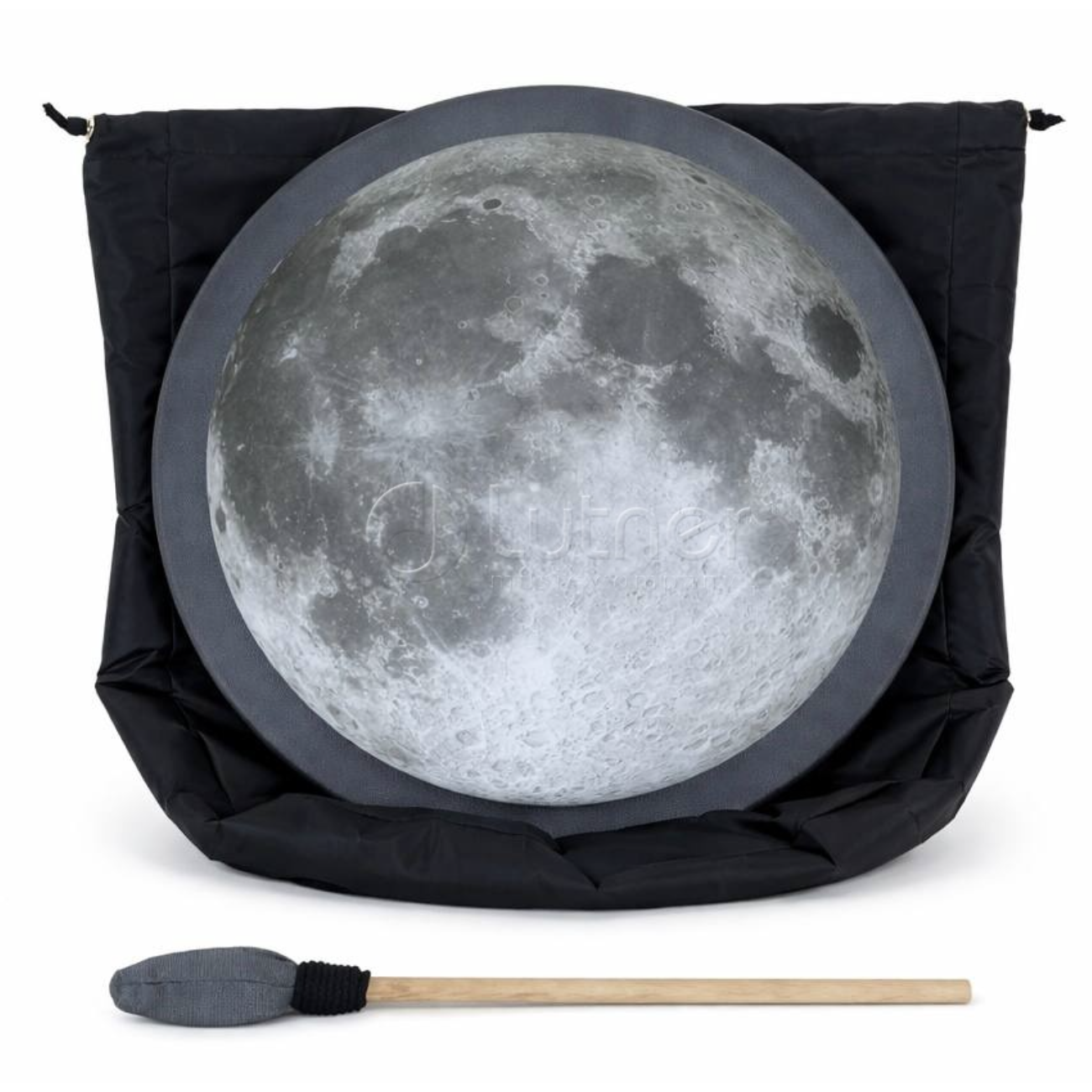 Это пневматический бубен «Луна» с одной мембраной из синтетической ткани, украшенный УФ-печатью с изображением луны. Инструмент позволяет регулировать натяжение мембраны с помощью встроенной резиновой камеры, что даёт возможность настраивать высоту звука.
