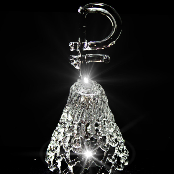 Изготовлен колокольчик вручную из тонких прутиков кварцевого стекла - чистого минерального стекла, которое иначе именуется горным хрусталем, так как имеет абсолютно схожий состав - чистый диоксид кремния.