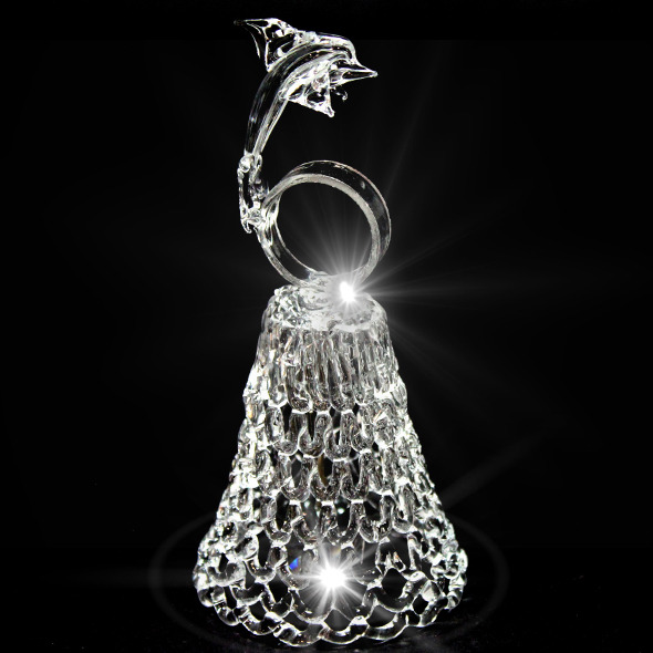 Изготовлен колокольчик вручную из тонких прутиков кварцевого стекла - чистого минерального стекла, которое иначе именуется горным хрусталем, так как имеет абсолютно схожий состав - чистый диоксид кремния.