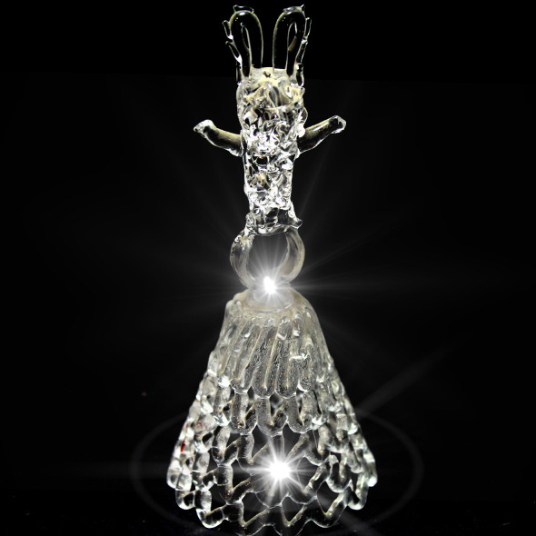 Изготовлен колокольчик вручную из тонких прутиков кварцевого стекла - чистого минерального стекла, которое иначе именуется горным хрусталем, так как имеет абсолютно схожий состав - чистый диоксид кремния.