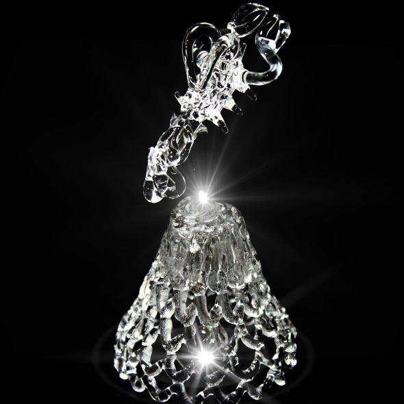 Изготовлен колокольчик вручную из тонких прутиков кварцевого стекла - чистого минерального стекла, которое иначе именуется горным хрусталем, так как имеет абсолютно схожий состав - чистый диоксид кремния.