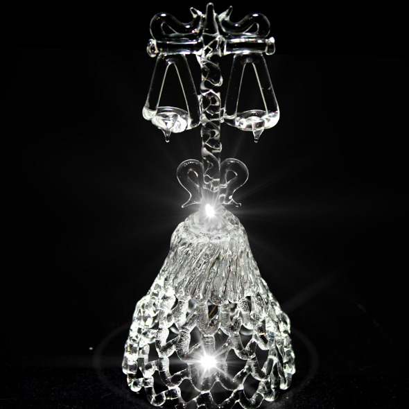 Изготовлен колокольчик вручную из тонких прутиков кварцевого стекла - чистого минерального стекла, которое иначе именуется горным хрусталем, так как имеет абсолютно схожий состав - чистый диоксид кремния.