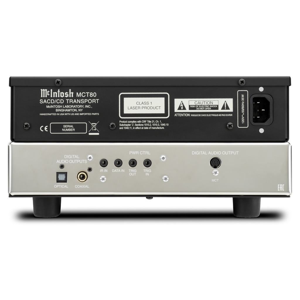 SACD/CD Transpor McIntosh MCT80 включает в себя 3 цифровых выхода: 1 коаксиальный и 1 оптический, а также 1 из наших проприетарных разъемов MCT. Выход MCT обеспечивает надежное соединение для воспроизведения DSD звука высокой четкости на SACD до уровня DSD128. Чтобы воспользоваться преимуществами уникальных возможностей SACD McIntosh MCT80, он должен использоваться с некоторыми моделями McIntosh, которые имеют вход MCT, который включают в себя вышеупомянутые MXA80 и MHA150, а также предусилители D1100, C52, C2600, C47 и D150, а также интегрированные усилители McIntosh MA9000 и McIntosh MA8900. Коаксиальные и оптические выходы поддерживают форматы аудио CD до 24 бит / 192 кГц. Для прослушивания компакт-дисков MCT80 можно использовать с любым продуктом, который имеет цифровой коаксиальный или оптический вход и цифро-аналоговый преобразователь (ЦАП).