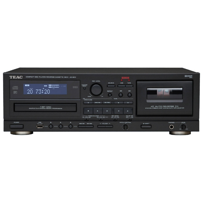 Кассетная дека в TEAC AD-800 снабжена автореверсом, системой шумопонижения Dolby NR, регулятором скорости ленты (Pitch Control), а для удобства записи предусмотрена переключаемая система автостарта. Весь процесс записи с любого источника сигнала можно контролировать с помощью органов управления на передней панели, что очень удобно, а ЖК-дисплей предоставляет пользователю исчерпывающую информацию. Также в комплекте с TEAC AD-800 поставляется и полнофункциональный пульт ДУ. На задней панели имеются RCA-разъемы аналоговых входа и выхода.