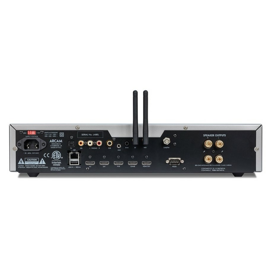 Зато с наличием интерфейсов нет никаких проблем. Arcam предлагает использовать новинку куда шире, чем элементарный приемник-передатчик аудио материалов. Для этого здесь предусмотрен квинтет HDMI-разъемов с различными гравировками, способствующими к быстрому созданию и отладки системы. Квартет обладает типом 1.4, через которые проще всего подключать приставки типа Apple TV, Amazon, Google Chromecast и прочих. Помимо этого, изделие сможет порадовать вас наличием Ethernet-разъема, совмещенного с портом USB 2.0. Через них открываются возможности создания единой LAN-библиотеки с функцией сетевого стриминга. Подтвержденный сертификат – DLNA 1.5. Ресивер так же способен выступать в роли передатчика Wi-Fi-сигнала, что может пригодиться в больших помещениях. Для этого разработчики установили дуэт современных антенн.