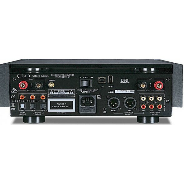 Quad Artera Solus объединяет в одном корпусе CD-транспорт, ЦАП, предусилитель и усилитель мощности. За обработку цифрового сигнала отвечает чип ESS9018 Sabre32, благодаря чему устройство умеет работать с данными в формате PCM до 32 бит/384 кГц и DSD64/128/256. Для дисков предусмотрен щелевой привод, а данные, перед тем как попасть в ЦАП, буферизуются.