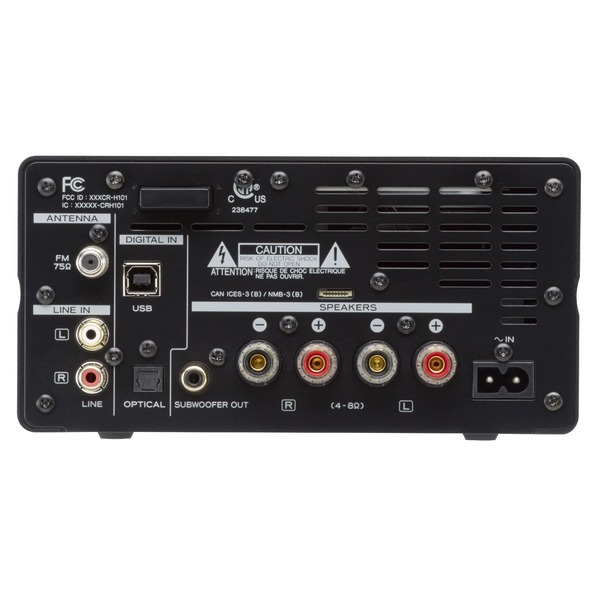 На задней панели находится линейный вход RCA, оптический вход и асинхронный USB-порт. Есть выход для сабвуфера и 4 винтовые клеммы для АС. Модель TEAC CR-H101 демонстрирует открытое, чистое и детальное звучание с хорошей динамикой и широкой звуковой сценой. Ресивер можно сочетать как с оптимизированными под него АС LS-101HR, так и с другими спикерами с импедансом от 4 до 8 Ом.