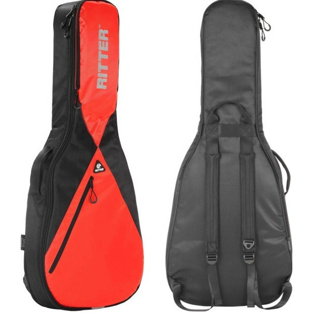 Чехол для акустической гитары. Защитное полужесткое уплотнение – 20 мм (15 мм (высокая плотность) + 5 мм (мягкая пена), материал – водонепроницаемый полиэстер (жаккард), светоотражающие элементы, светоотражающая нашивка Ritter, удобные ручки для переноски, рюкзачные лямки, карман А4 формата для нот и аксессуаров, карман для педали, плюшевая подкладка внутри чехла, дополнительная защита в районе порожка и головки грифа, дополни-тельный карман для медиаторов.