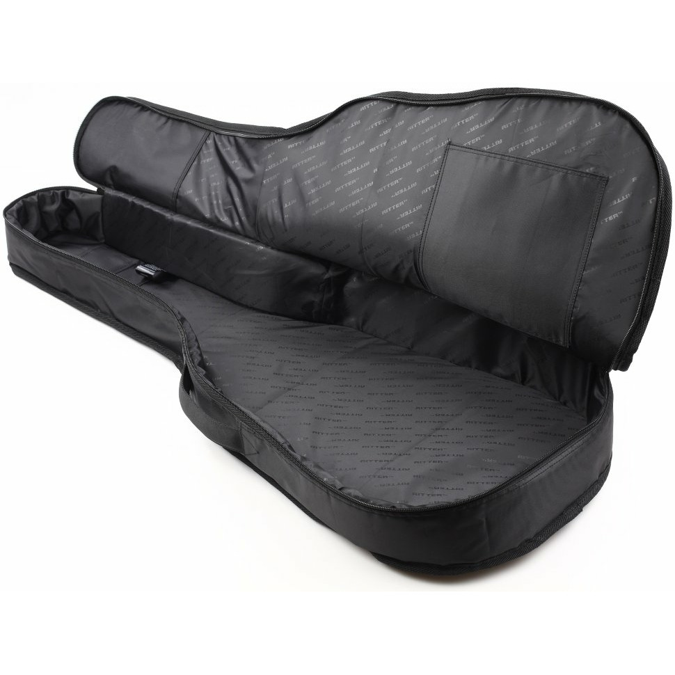 Чехол для классической гитары. Защитное полужесткое уплотнение – 20 мм (15 мм (высокая плотность) + 5 мм (мягкая пена), материал – водонепроницаемый полиэстер (жаккард), светоотражающие элементы, светоотражающая нашивка Ritter, удобные ручки для переноски, рюкзачные лямки, карман А4 формата для нот и аксессуаров, карман для педали, плюшевая подкладка внутри чехла, дополнительная защита в районе порожка и головки грифа, дополни-тельный карман для медиаторов.