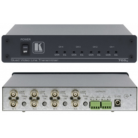 Передатчик 703XL предназначен для передачи композитных сигналов видео на удаленные устройства по витой паре (рекомендуется использовать неэкранированные провода). Устройство может использоваться в комбинации с приемником 706XL. 703XL оснащен четырьмя проходными видеовходами, сигнал с которых поступает на четыре независимых выхода (клеммные модульные разъемы). Каждый выход имеет регуляторы уровня сигнала и контроля АЧХ. Приемник 706XL, работающий в паре с передатчиком 703XL, имеет проходной вход для дополнительной коммутации (клеммные модульные разъемы, с переключателем эквивалентной нагрузки). Он также имеет регуляторы уровня сигнала и контроля АЧХ. При использовании высококачественных кабелей можно передавать полный диапазон цветных видеосигналов на расстояние до 1000 м. Вещательное качество сигнала (12 МГц) обеспечивается на расстоянии до 300 м. На меньших расстояниях поддерживается полоса пропускания сигнала до 30 МГц. Подобное устройство идеально подходит для организации системы дистанционного контроля. Оно служит альтернативой дорогостоящим оптическим или беспроводным передающим устройствам. При помощи адаптера RK-1 прибор устанавливается в стандартную 19'' стойку ( 2 модуля, занимаемая высота - 1 U). В комплект входит источник питания 12 B.