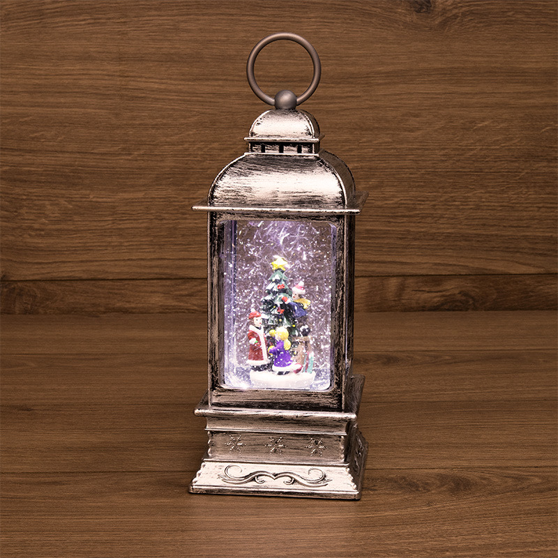 Декоративный фонарь «Рождество» — великолепное интерьерное украшение, символизирующее Новый год и Рождество. Светильник с эффектом снегопада и подсветкой выполнен в серебристом цвете, внутри находятся фигурки детей, наряжающих елку. Портативный фонарь питается от 4 батареек типа ААА или от сетевого блока через USB-шнур. Вьюга, создаваемая сверкающими блестками, кружится внутри колбы и подсвечивается белыми диодами. Декоративный фонарь станет прекрасным подарком детям и взрослым, принесет атмосферу зимней сказки в ваш дом.