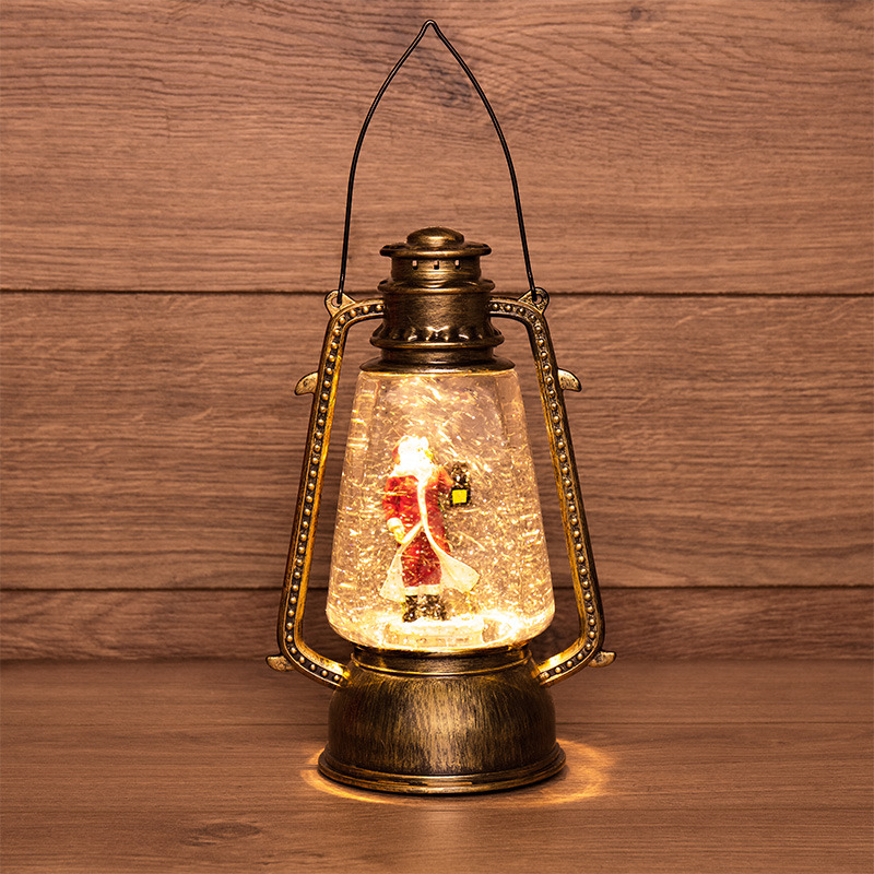 Декоративный фонарь с эффектом снегопада и подсветкой «Санта Клаус» — прекрасное решение для создания праздничной атмосферы в доме, которое поможет почувствовать уют и окунуться в настоящую зимнюю сказку. Светильник с диодами, излучающими теплый белый свет, питается от 4 батареек типа ААА и является абсолютно безопасным в использовании. Можно подключить изделие к ноутбуку через USB-кабель или к сети при помощи адаптера. Высота корпуса — 25 см. В прозрачной колбе находится яркая фигурка Санта Клауса, вокруг которой искрится вихрь золотистых блесток. Корпус фонаря выполнен в бронзовом цвете с эффектом старения поверхности.