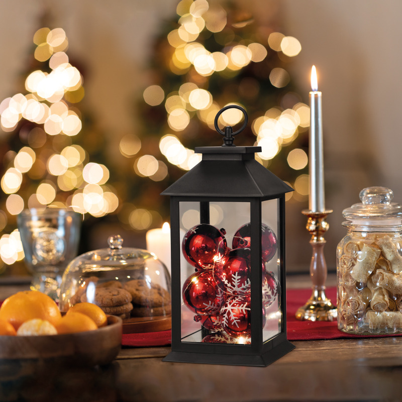 Декоративный фонарь с шариками олицетворяет тепло и домашний уют в преддверии Нового года, помогает сделать домашние вечера в кругу семьи комфортными и поднимает настроение окружающим. Оригинальное изделие в корпусе черного цвета станет стильным дополнением праздничной обстановки. Для подвешивания предусмотрено кольцо в верхней части. Экономичные диоды, подсвечивающие композицию, излучают теплый белый свет. В качестве элементов питания используются 3 батарейки тип ААА, которые делают фонарь мобильным – для работы не нужна розетка.