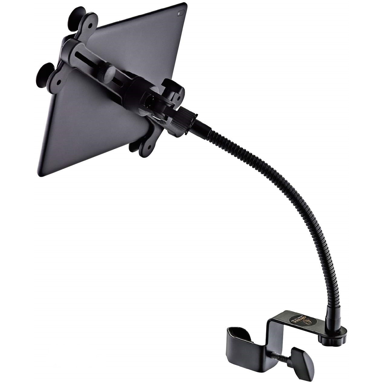 Вы можете установить его с помощью фиксатора на стойку ниже микрофона, либо же за счет резьбы 5/8" прикрепить непосредственно к стойке. Поворотный механизм позволяет зафиксировать планшет как в альбомном, так и в книжном положении, а прочная и гибкая гусиная шея предоставляет возможность подобрать оптимальный угол наклона.