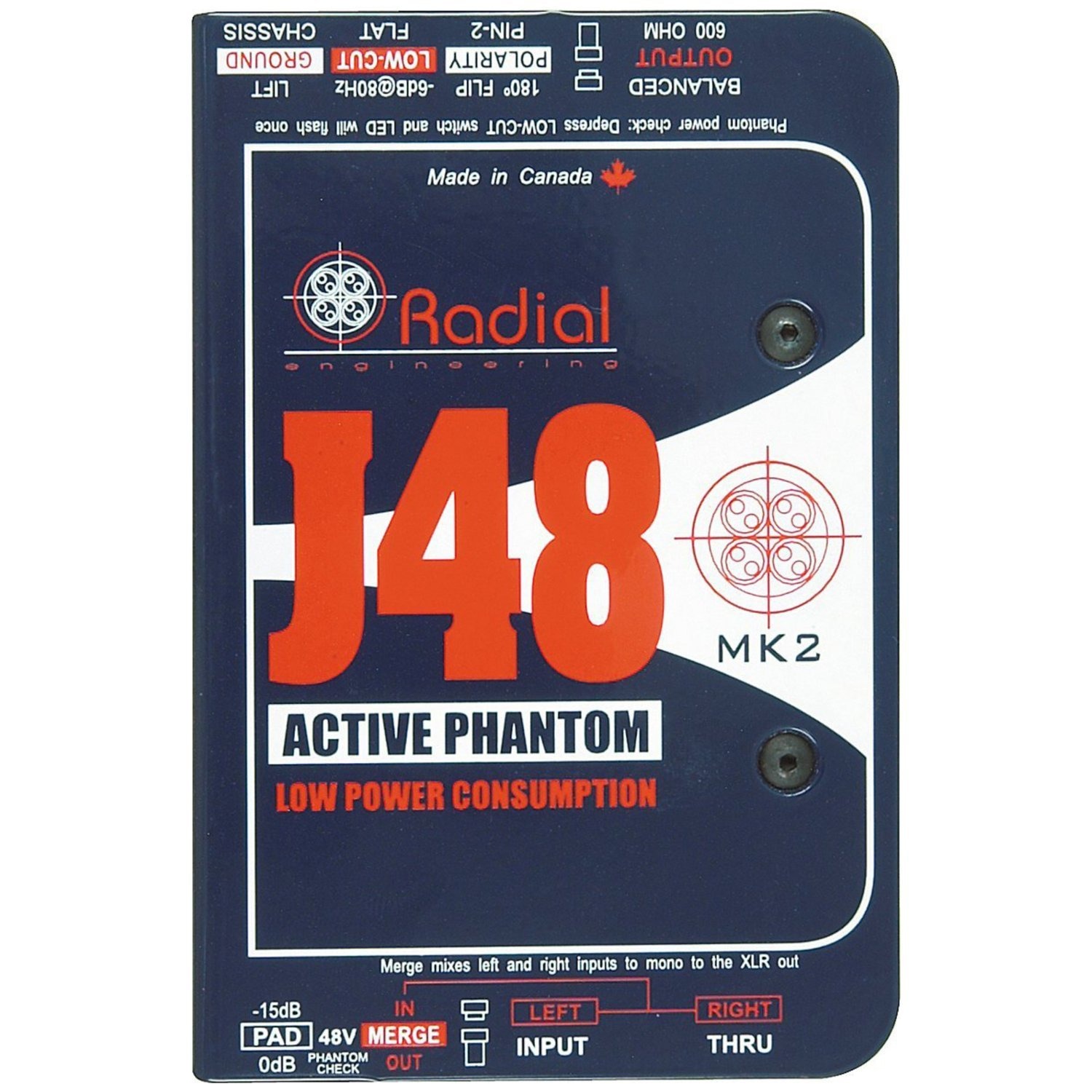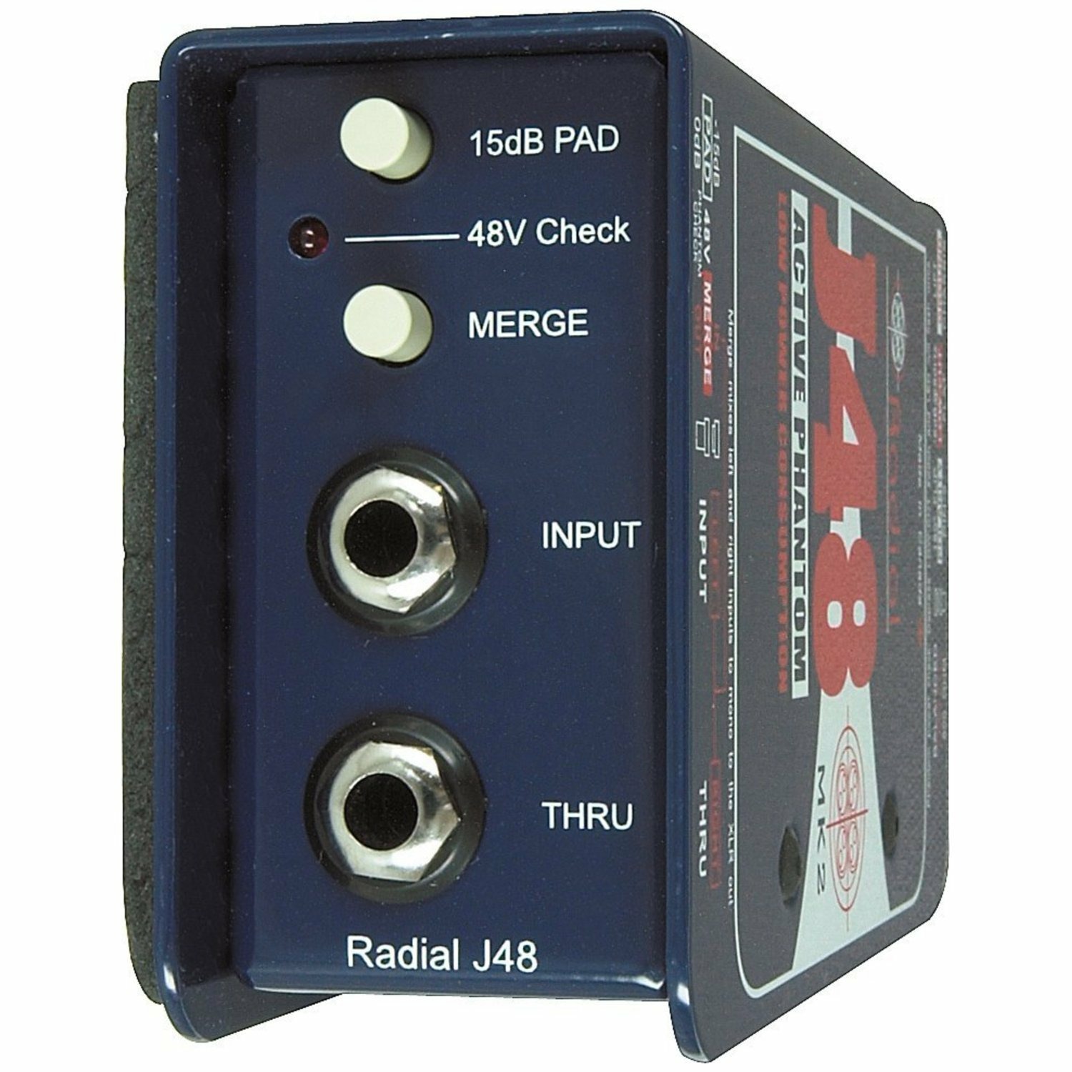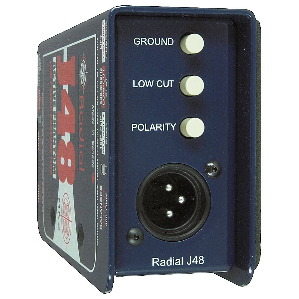 Radial J48 - Активный 1-канальный директ-бокс профессионального уровня, вх/вых 220 кОм/100 Ом, функция суммирования стерео источника в моно, аттенюатор, заземление, работает от фантомного питания 48В.