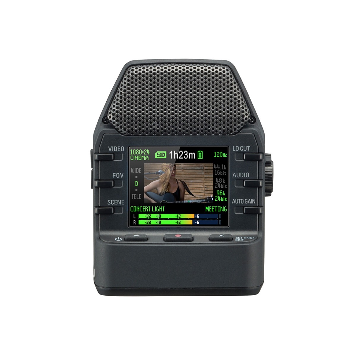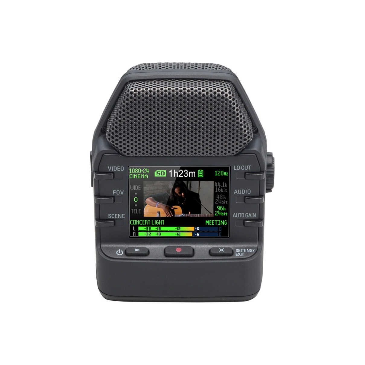Рекордер Q2n оснащен 160-градусным широкоугольным объективом, который способен снимать видео потрясающего качества. Запись ведется в разрешениях 720p или 1080p с частотой кадров 24 или 30 FPS. Диафрагма F2.0 делает Q2n идеальным выбором для музыкантов, которые выступают в разнообразных условиях освещения. Вы можете снимать всю сцену или сфокусировать свое внимание на одном конкретном артисте, используя один из пяти режимов Field of View (Поле зрения). А цветной LCD-дисплей облегчит вам поиск идеального ракурса, а также позволит вам быстро просматривать получившееся видео