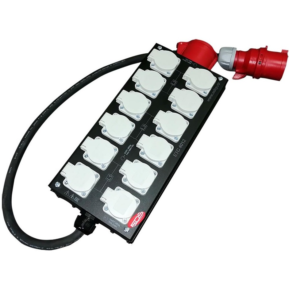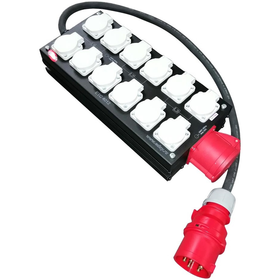 Дистрибьютор питания для подключения звукового и светотехнического оборудования внутри помещений. Осуществляет коммутацию от кабельной вилки PCECEE32A 5-pol IP44 до встроенных розеток PCE Schuko 16A, а также сквозную коммутацию до выходной розетки PCE CEE32A 5-pol IP44. Резиновый кабель H07RN-F 5G6 длиной 1 метр с кабельной вилкой PCE CEE32A 5-pol IP44. Надежная конструкция из алюминиевого профиля и 1,5мм стали. Резиновые ножки для установки на пол, продольные пазы для крепления с помощью струбцины. Черное порошковое покрытие.