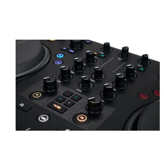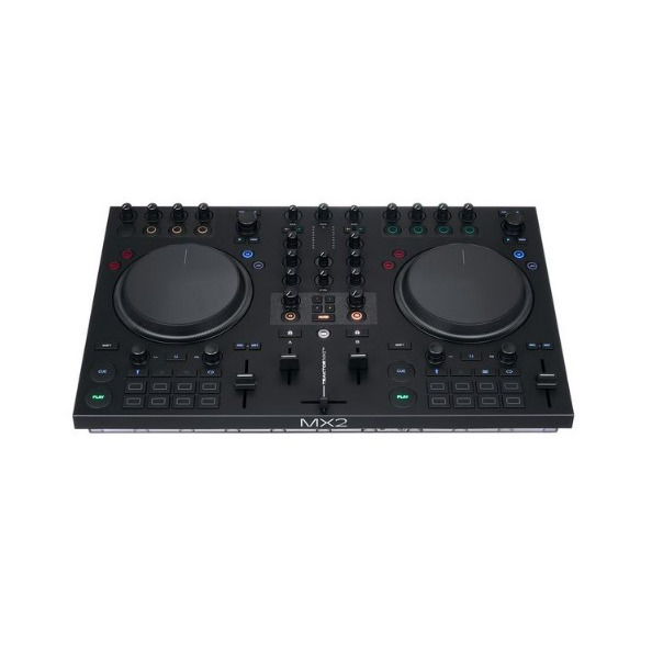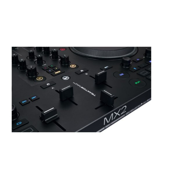 Native Instruments Traktor MX2 — двухканальный DJ-контроллер с аудиоинтерфейсом 24 бит / 96 кГц, предназначенный для работы с Traktor Pro 4 (поставляется в комплекте). Контроллер оснащён двумя сенсорными jog-колёсами с режимами Turntable и Jog, двумя фейдерами, кроссфейдером, 3-полосным эквалайзером на каждом канале и визуальными VU-метрами. MX2 позволяет управлять до 16 эффектами, включая полный набор Mixer FX и Deck FX, с доступом к 40+ студийным эффектам Native Instruments. Контроллер имеет 16 RGB перформанс-пэдов с четырьмя режимами (Hotcues, Stems, Flux Loops, Pattern Player), шесть энкодеров и 21 потенциометр. В режиме Pattern Player перформанс-пэды превращаются в пошаговый секвенсор, позволяя создавать живые ритмические паттерны и накладывать их поверх треков. Аудиоинтерфейс предоставляет мастер-выходы RCA и мини-джек 1/8", выходы на наушники 1/8" и 1/4", микрофонный вход 1/4", а также USB-C для подключения к компьютеру. Питание осуществляется через USB или внешний адаптер. MX2 поддерживает синхронизацию по MIDI clock, подсветка кнопок и нижней панели позволяет интуитивно ориентироваться в затемнённом помещении. Контроллер совместим с macOS 12–15 и Windows 10–11, минимальные требования — 4 ГБ ОЗУ и процессор Intel Core i5 или аналогичный.