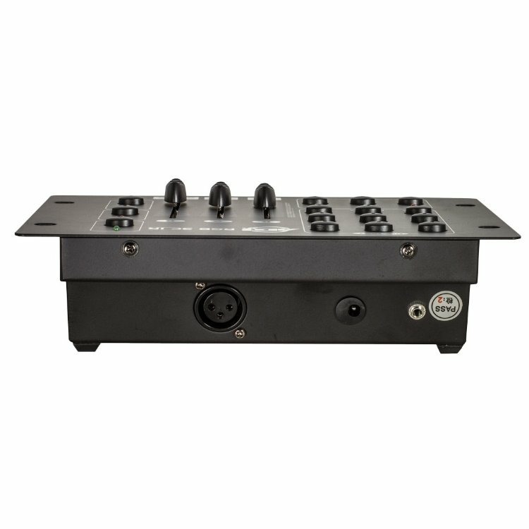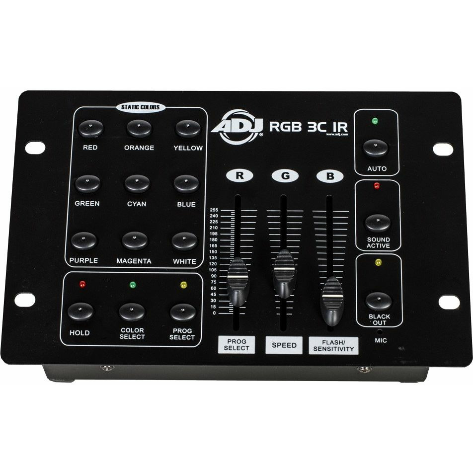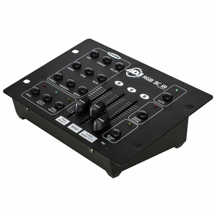 American DJ RGB 3C IR - 3-канальный контроллер базового уровня для светодиодных устройств RGB. Устройство управляет любым стандартным 3-канальным устройством RGB (канал 1 – красный, 2 – зеленый, 3 – синий). Все светодиодные устройства должны настраиваться для работы в режиме DMX с адресацией на DMX-канал 1. Панель управления включает 9 кнопок прямого доступа к статическим цветам (преднастройки цветов), 3 ручных RGB-фейдера (настройка нужного цвета во время работы), кнопку выбора программ (доступ к 7 статическим цветам и 10 программам чейзов с помощью фейдера выбора программ), кнопку звуковой активации (активация 10 программ чейзов для выбора случайной последовательности через внутренний микрофон) и кнопку автозапуска (активация 10 программ чейзов для выбора случайной последовательности с возможностью регулировки скорости чейзов с помощью фейдера скорости). Кнопка удержания блокирует все кнопки и фейдеры и останавливает текущую сцену (контроллер остается заблокированным даже при отключении и повторном включении питания). Наконец, имеется кнопка затемнения для обнуления всех значений, которая отключает передачу выходной мощности на осветительные устройства. Это устройство является идеальным решением для диджеев, а также небольших ночных клубов и баров, которым нужен простой светодиодный контроллер для организации шоу.
