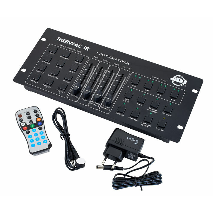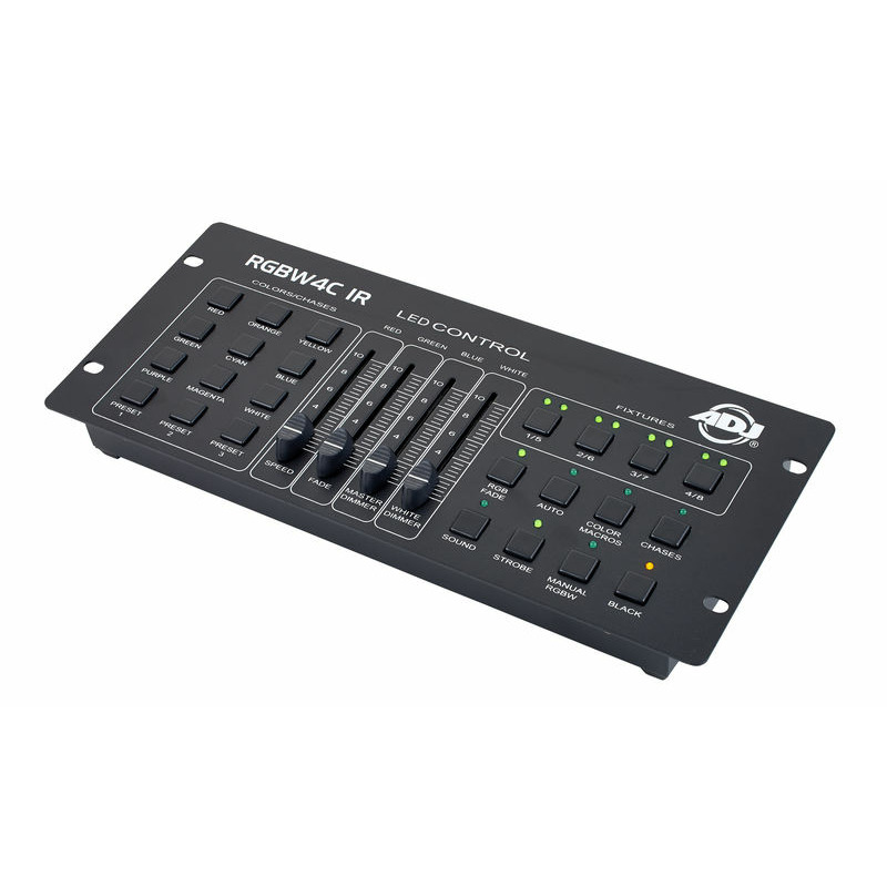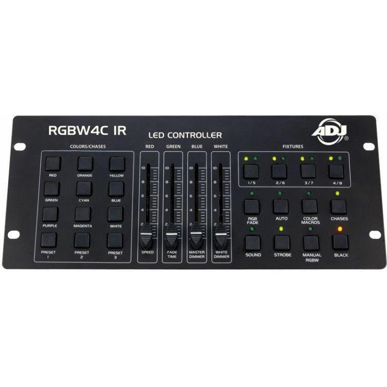 RGBW4C IR – это 32-канальный контроллер светодиодных устройств RGB, RGBW и RGBA. Устройство предназначено для управления любой стандартной 3- или 4-канальной группой светодиодных устройств (канал 1 – красный, 2 – зеленый, 3 – синий, канал 4 – белый или желтый). С помощью 4 кнопок устройств можно подключить для независимого управления до 8 светодиодных устройств или групп устройств. Все светодиодные устройства или группы устройств должны настраиваться для работы в режиме DMX с адресацией по 4 отдельным каналам для независимого управления. Панель управления включает 9 кнопок прямого доступа к статическим цветам/чейзам с предварительно запрограммированными преднастройками цветов и программами чейзов, 3 программируемых пользователем кнопки преднастройки цветов, 4 многофункциональных фейдера, которые позволяют на ходу регулировать интенсивность RGBW-излучения, а также программы чейзов Speed, Fade Time и Master Dimmer. Кроме того, имеется 8 кнопок для выбора рабочего режима (RGB Fade, Auto Run, Color Macro, Chase, Sound Active, Strobe, Manual RGBW и Blackout). RGBW4C – один из самых простых и универсальных светодиодных контроллеров, предлагаемых сегодня на рынке. Он идеально подходит для диджеев, а также ночных клубов и баров, которым нужен простой светодиодный контроллер прожекторов, прожекторных штанг, заливного света и осветительных панелей.