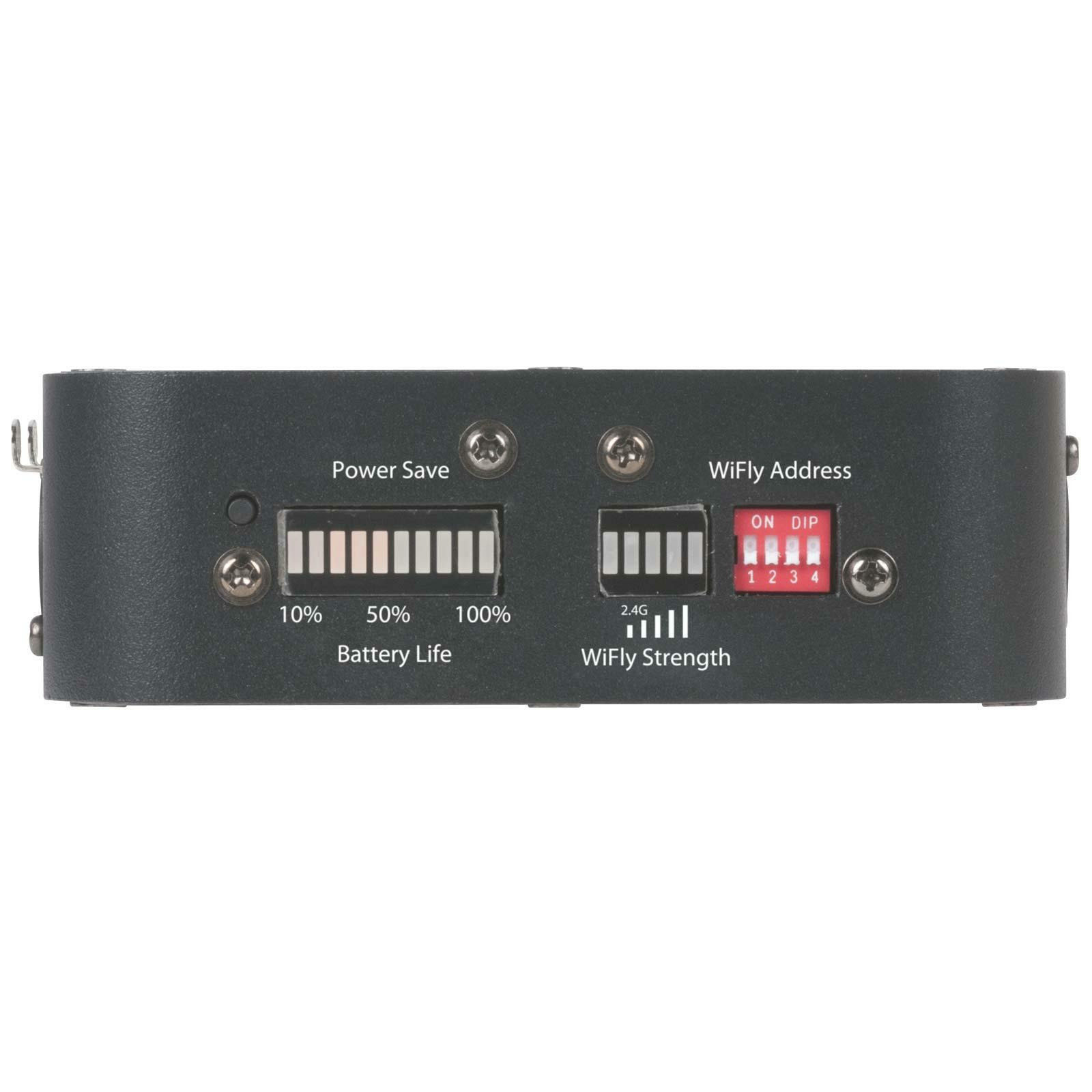 Время работы батареи устройства WiFly EXR BATTERY составляет до 20 ч. Сбоку устройства имеются цифровые индикаторы заряда батареи и силы беспроводного сигнала WiFly. Кроме того, магнитная пластина снизу позволяет легко и быстро устанавливать приемопередатчик WiFly EXR BATTERY на временной основе на металлическое осветительное устройство или другой предмет. Частота беспроводной связи – 2,4 ГГц; она используется в радиочастотном диапазоне вместе с технологиями Bluetooth и Wi-Fi.