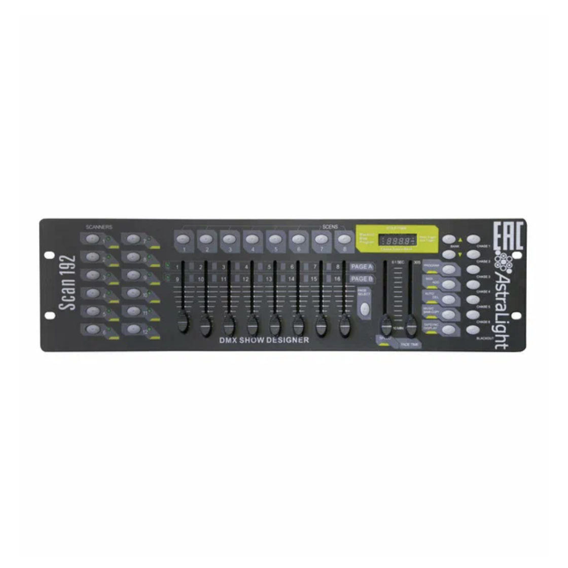 AstraLight Scan 192 - DMX контроллер, предназначенный для цифрового управления различными приборами сценических эффектов , такими как: вращающиеся головы, сценический свет, динамическими приборами и генераторами дыма. Предоставляет возможность управления 12 приборами по 16 каналов в каждом. Оснащен функцией программирования памяти, в ячейках которой можно сохранить до 240 различных сценариев эффектов освещения. Также, доступен автоматический режим работы или управление воспроизведением под музыку с помощью встроенного микрофона. Цифровой формат DMX-512 контроллера использует в своей работе "адреса" для индивидуального управления подключенными приборами освещения.