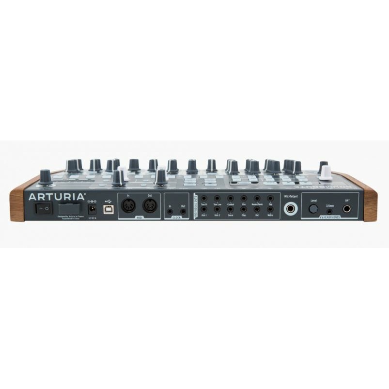Arturia DrumBrute аналоговая драм машина. Данная модель является функциональной драм-машиной с возможностью секвенсора. Особенностью DrumBrute является 17 аналоговых ударных, начиная от бас-бочки до перкуссионных элементов. Также данная драм машина оснащена оригинальным Steiner-Parker фильтром на выходящем мастер канале, что позволяет использовать его для создания вариативного звучания. В секвенции Вы можете установить до 64 шагов, при этом есть возможность переключения между 64 секвенциями с возможностью соединения друг с другом. Также одной из особенностей данного аппарата является почти полное отсутсвие многозадачности на одном регуляторе или кнопке, другими словами почти каждый регулятор отвечает только за определенную функцию, чтобы не терять времени на навигацию, а больше времени уделять созданию композиции. На передней панели также располагаются все регуляторы ударных элементов (Attack, Decay, Level, Pitch) чтобы дать вам быстрый доступ к настройке. На задней панели располагаются MIDI In/Out, отдельные 3,5 мм выходы для ударных, два выхода для наушников 3,5 мм и 1/4 ", а также MIX OUTPUT. Arturia DrumBrute также оснащен USB интерфейсом для подключения к компьютеру. В итоге можно сказать, что данный прибор идеально впишется в дополнение к приборам серии Brute, а также может быть использован и с другими синтезаторами и модулями как в живом выступлении, так и в студийной работе.