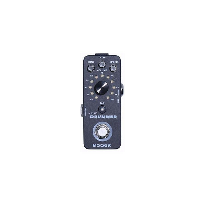MOOER MICRO DRUMMER - компактная драм машина в формате гитарной педали. MOOER MICRO DRUMMER - компактная драм машина, способная легко поместиться в ваш педалборд. Обширный арсенал из 121 ритмов, охватывает разнообразные музыкальные стили и может быть синхронизирован с нужным темпом при помощи функции tap tempo.