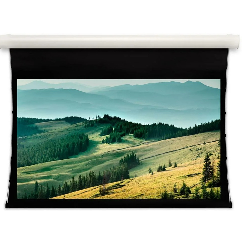 Проекционный экран с электроприводом со стильным дизайном, предназначенный для крепления на стене или потолке.