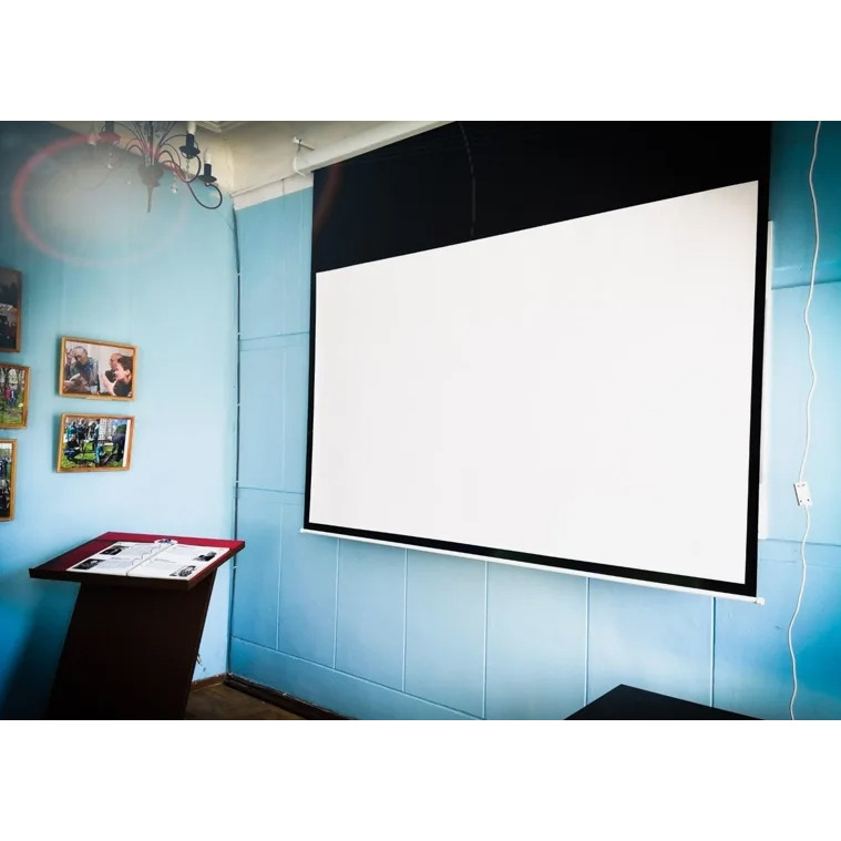 Моторизированный настенный экран больших размеров. Шестигранный стальной корпус, бесшумный мотор с электроприводом, встроенное в корпус крепление, белое полотно MW с черной подложкой и утяжелителем для безупречно ровной поверхности. 3-позиционная кнопка управления в комплекте. Предназначен для больших аудиторий, концертных и конференц-залов.