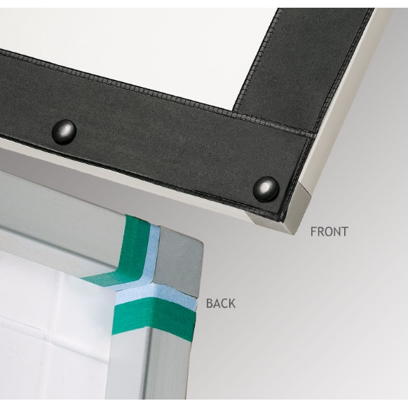 Экран для шоу и презентаций современного вида. Предназначен для постоянной фронтальной или обратной проекции. Гибкая проекционная поверхность протянута идеально плоско. Пристегивается на кнопках к 1” (2,54 см) полой алюминиевой раме. Проекционная поверхность полностью скрывает раму под 2” (5 см) черными кромками из кожзаменителя, расположенными по периметру проекционной поверхности. Матерчатые петли натяжения в каждом углу по верхности помогают натянуть полотно экрана при ее установке. Матерчатые петли можно отрезать после установки поверхности на раму.