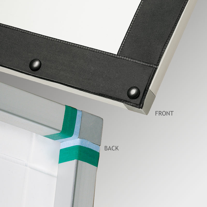 Экран для шоу и презентаций современного вида. Предназначен для постоянной фронтальной или обратной проекции. Гибкая проекционная поверхность протянута идеально плоско. Пристегивается на кнопках к 1” (2,54 см) полой алюминиевой раме. Проекционная поверхность полностью скрывает раму под 2” (5 см) черными кромками из кожзаменителя, расположенными по периметру проекционной поверхности. Матерчатые петли натяжения в каждом углу по верхности помогают натянуть полотно экрана при ее установке. Матерчатые петли можно отрезать после установки поверхности на раму.