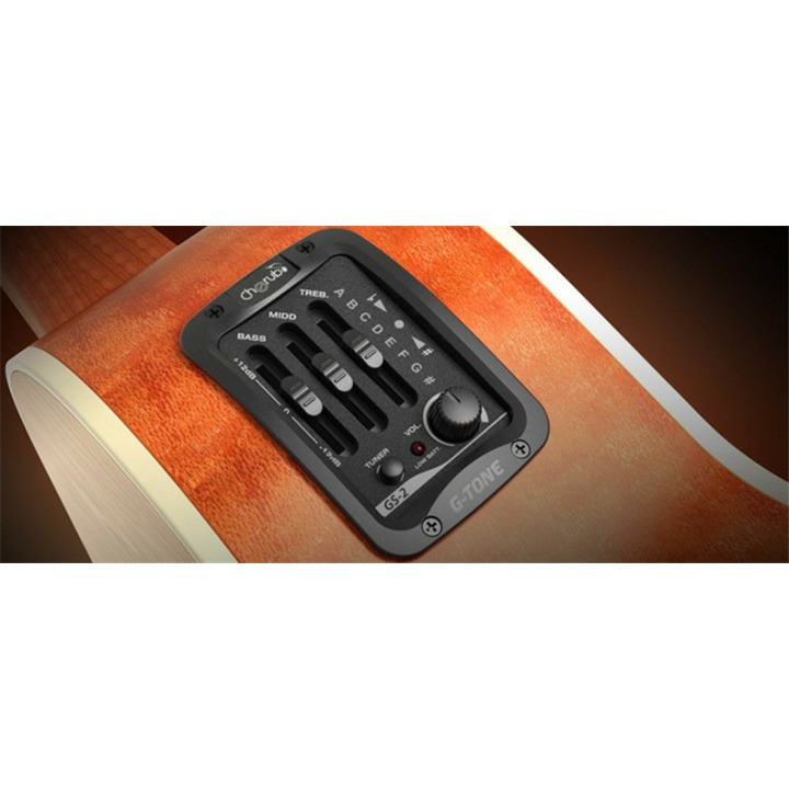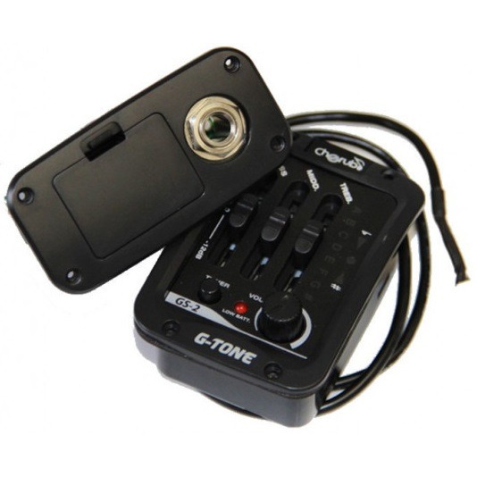 GS-2 - темброблок для акустической гитары от компании Cherub. Он оснащен трехполосным эквалайзером (Low, Middle, High), регулятором громкости и встроенным хроматическим тюнером. Темброблок автоматически включается при подсоединении кабеля и автоматически выключается, когда кабель достается из выходного разъема. Светодиодный индикатор заряда батареи загорается красным, когда батарейку необходимо заменить. В комплекте с темброблоком идет пьезокерамический звукосниматель, отсек для батарейки с разъемом, а также все необходимое для их установки.