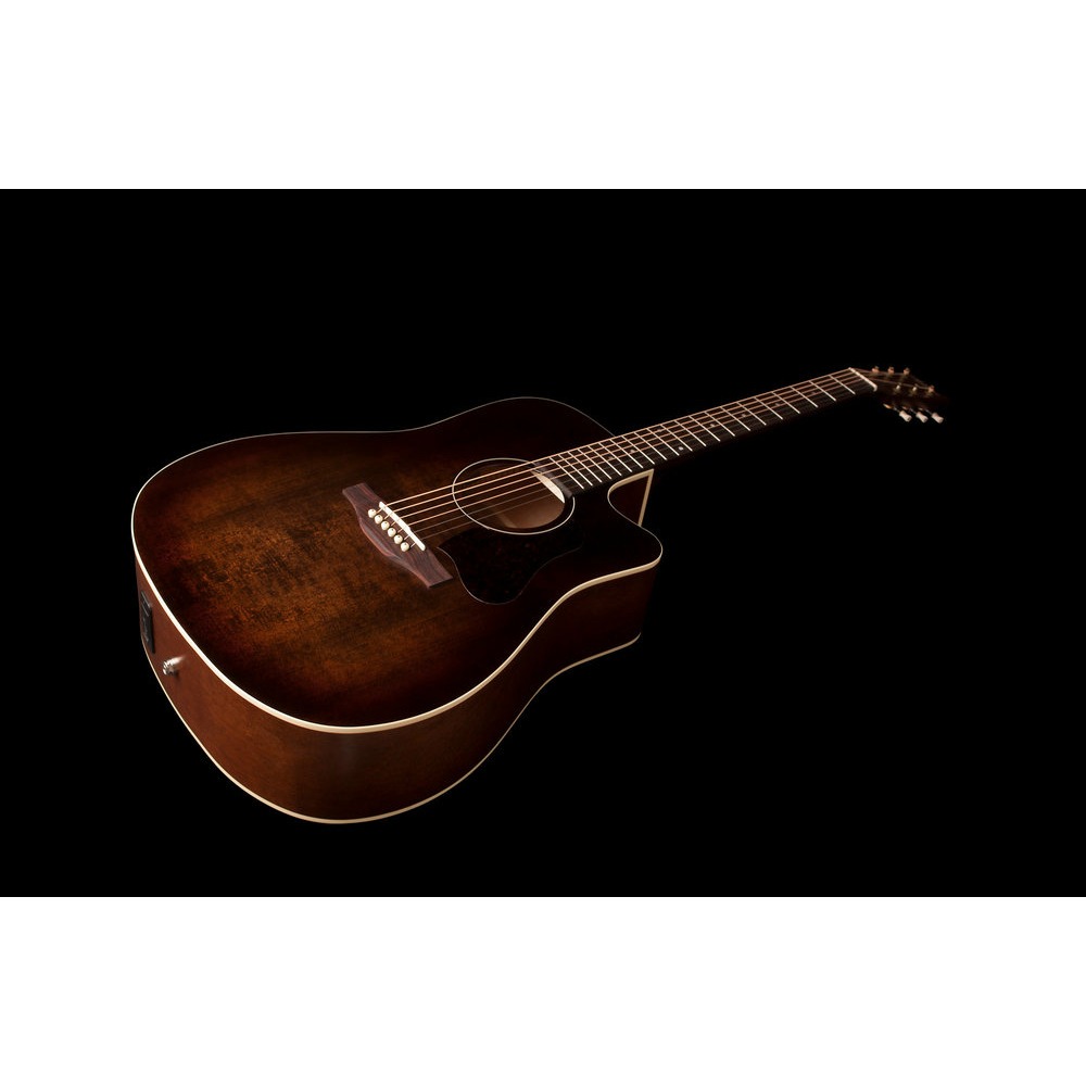 Сохраняя вековые традиции универсальности дредноутов, электро-акустическая гитара Art & Lutherie Americana Bourbon Burst CW QIT представляет собой заново изобретенную классику. Лучше всего этот инструмент можно описать как на треть рабочая лошадка за ее долговечность, а на две трети — чистокровный жеребц за изысканное звучание и артикуляцию. Она на имеет корпус популярной формы "дредноут", обеспечивающей мощное, громкое и объемное звучание. Верхняя дека выполнена из массива ели, а нижняя дека и обечайки - из дикой вишни. Гриф сделан из серебристого клена и имеет накладку из палисандра (21 лад). У грифа двухсторонний анкер для настройки оптимального угла прогиба. Здесь установлен звукосниматель Godin Q1T со встроенным тюнером. Порожки гитары - графитовые Graphtech Tusq, гарантирующие правильную интонацию всех нот и длительный сустейн. Колки - открытые, с передаточным числом 18:1.