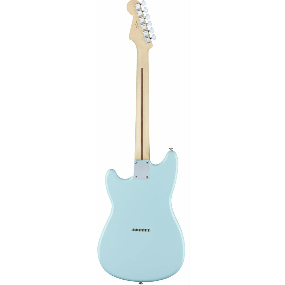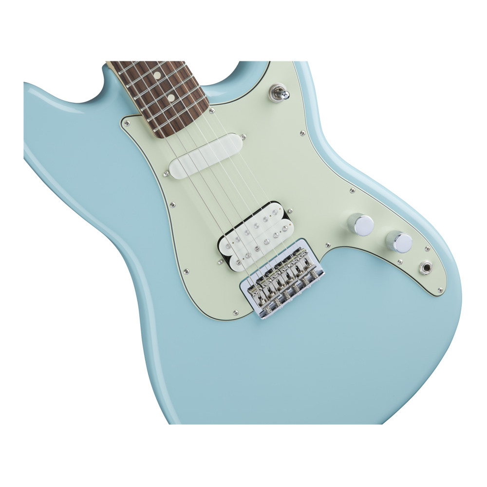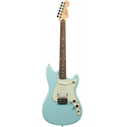 FENDER DUO SONIC HS PF DNB – модернизированная современная версия инструмента, впервые выпущенного Fender в 1956 году. Это гитара в компактном корпусе с мощным звуком, которая станет отличным выбором для музыкантов, которые готовы к экспериментам. Дека оригинальной формы Duo-Sonic™ выполнена из ольхи с глянцевым покрытием. Особенность данной модели – укороченная мензура – 24 дюйма (610 миллиметров), которая была впервые представлена в 60-х годах на моделях Jaguar и Mustang и по сей день остаётся оригинальным элементом дизайна Fender. Гриф современного профиля «C» выполнен из клёна, отделка – матовая полиуретановая. Ещё одна особенность данной гитары – накладка на гриф из железного дерева, пао ферро, которое сочетает в себе лучшие свойства палисандра и черного дерева, как физические, так и акустические. На грифе 22 лада Medium Jumbo с инкрустацией точками. Звукосниматели – хамбакер Duo-Sonic™ у бриджа и сингл Duo-Sonic™ у грифа. Переключатель – трёхпозиционный. Настройка звука осуществляется регуляторами громкости и тембра. Бридж – фиксированный 6-Saddle Strat®, струны сквозь корпус. Представленная модель Duo-Sonic™ – элегантного светло-голубого цвета с контрастным трёхслойным мятным пикгардом.